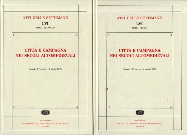 Fondazione Centro italiano di studi sull'alto Medioevo Città e campagna nei secoli altomedievali : Settimane di studio della Fondazione Centro italiano di studi sull'alto Medioevo, 56. : Spoleto, 27 marzo-1 aprile 200. Spoleto, presso la sede della Fondazione 2009 multilingual, 2 vol. 2009. Copertina editoriale rigida. 2 volumi (XIV, 1084 p. complessive) ; 25 cm In copertina: Atti delle settimane, 56.