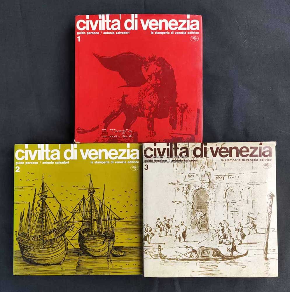 3 voll.; in 8° carrè; pp. 390 (2), (5) 400-807 (5), (5) 820-1425 (3) (ill. in bn.); leg. con sovracop. Vol. I: Le origini e il medioevo; vol. II: Il Rinascimento; vol. III: L'Età Moderna Venezia. Questa importante opera su Venezia è un nuovo modo di vedere e capire la città. Le componenti artistiche. urbanistiche, culturali sono state presentate come un tutto unico strettamente intrecciato agli eventi politici, sociali ed economici che hanno caratterizzato la successione storica di una grande struttura civile maturata. L'opera, sorretta da un partecipato supporto culturale, cui si accompagna una ricca ed originale dotazione illustrativa, si è proposta di essere aperta ed accessibile ad ogni lettore che voglia allargare l'ottica di conoscenza di Venezia