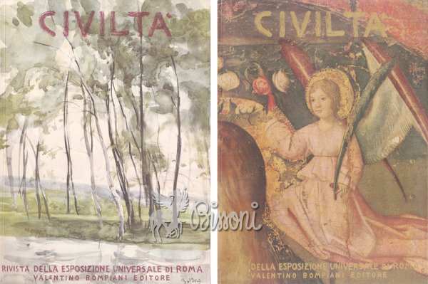 Colophon (entrambi volumi): Questo decimo/undicesimo di Civiltà Rivista Bimestrale della Esposizione Universale di Roma è stato stampato su carta da illustrazioni a doppia patinatura della Cartiera Ambrogio Binda. Le pagine in tipografia sono state stampate dalla Grafitalia, da Raffaello Bertieri, dalle Arti Grafiche di Bergamo, e dallo Stabilimento Grafico Giani.