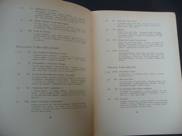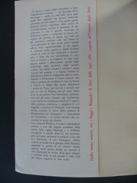 DESCRIZIONE: Einaudi Torino 1955 VIII^ Ed., br. ed. con sovracc. ill. a col. Con 35 tavole fuori testo di illustrazioni fotografiche in bianco e nero ed a colori, numerose illustrazioni, disegni, cartine in bianco e nero nel testo, e due cartine a fine vol. di cui una ripieg. pp. 502 in 8°. Prefazione di R.Bianchi Bandinelli. Affascinante rievocazione di scavi e spedizioni alla scoperta dei segreti del passato. CONDIZIONI: Ottime/Perfette. Questo libro proviene da una importante biblioteca privata, per cui alla prima bianca sono riportati i codici di catalogazione oltre all’etichetta sul dorso. PESO / WEIGHT: 880 gr. without package