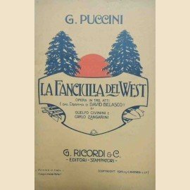 La fanciulla del West. Opera in tre atti (dal dramma di David Belasco), di Guelfo Civinini e Carlo Zangarini, musica di Giacomo Puccini, G. Ricordi e C. Editori-Stampatori, Milano 1910, pp. 89, testatine e finalini ill. b.n., cm 20, pubblicazione spillata. Timbro a secco dell’editore alla prima di copertina. Lievi tracce d’uso, leggera brunitura della carta, qualche macchiolina, per il resto ben conservato.