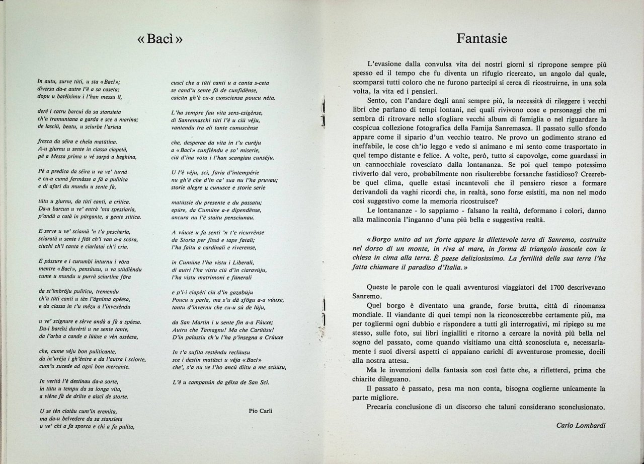 Editore: Famija Sanremasca Formato: in 8^, brossura Pubblicazione annuale incentrata sulla storia e la cultura di Sanremo. Vi sono all'interno testi in dialetto tra cui una poesia di Giuseppe Ferrari (artista sanremasco) e un'intera sezione denominata "poeti e narratori sanremaschi", contenente alcune opere dialettali.Rarissimo. Buone condizioni generali