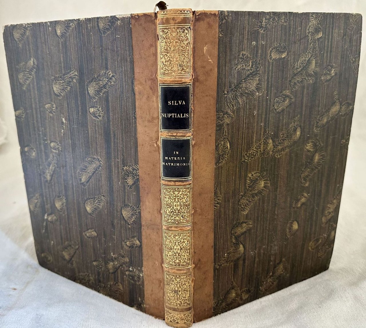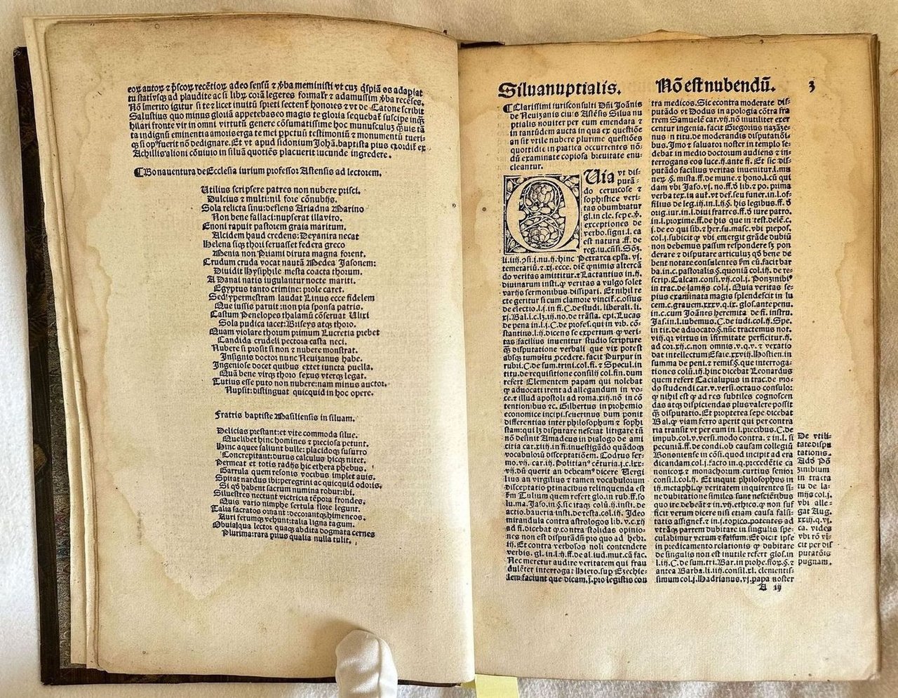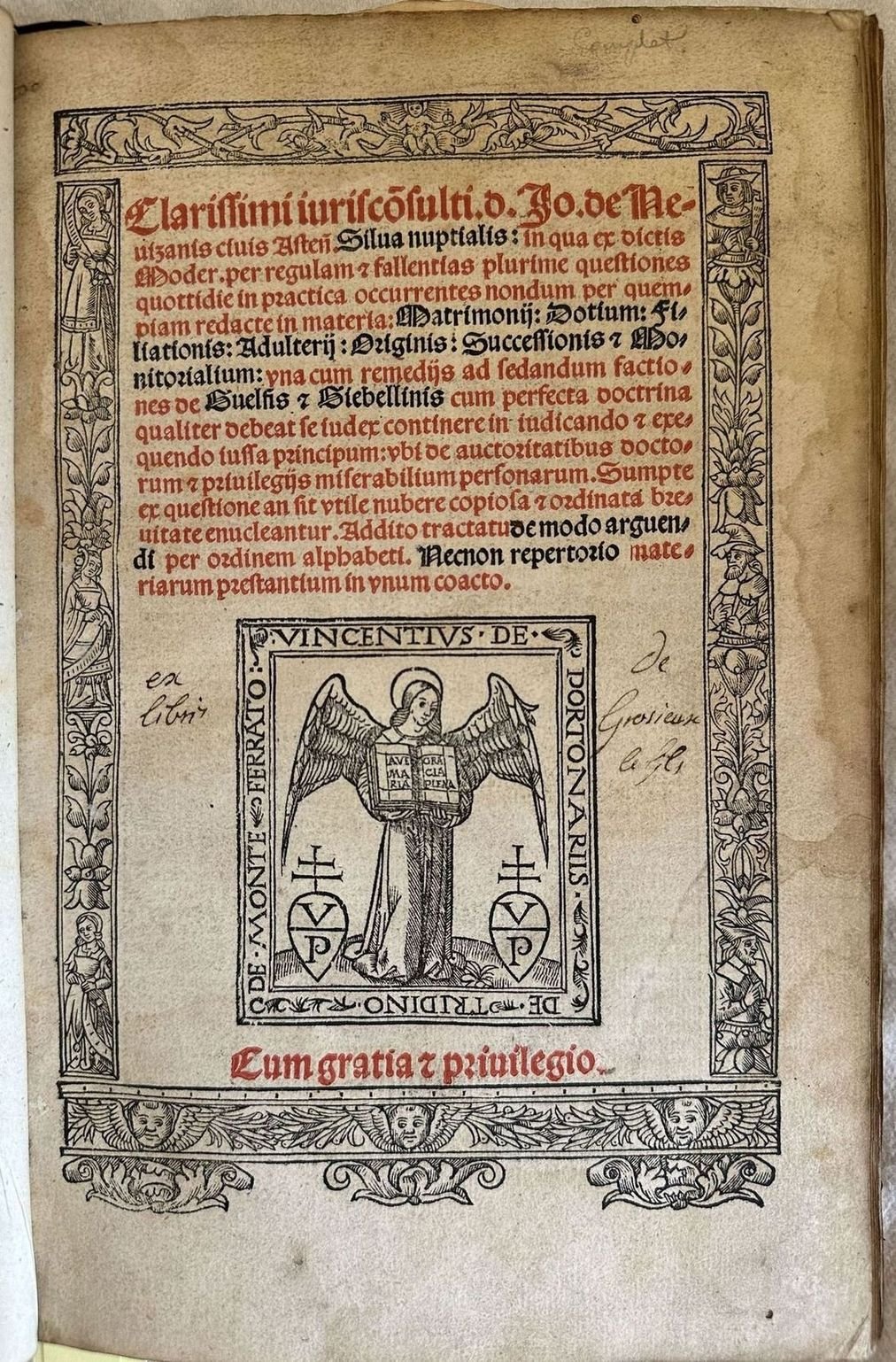 Edizione del 1524 di questo trattato di diritto matrimoniale del giuresconsulto Giovanni Nevizzano (m. 1540) astigiano che compì gli studi a Pavia e Padova e insegnò a Torino. Questa opera, pubblicata per la prima volta nel 1518, è la sua più celebre. E' un trattato in forma di quaestio nella quale l'autore disquisice sull'utilità o meno del matrimonio con una rassegna esaustica dei "fundamenta" che sconsigliano di contrarre il vincolo nuziale in particolare a determinate categorie di persone o che invece incoraggiano a farlo. L'opera costituisce uno dei principali conttributi di matrice giuridica alla "querelle des sexes" rinascimentale sia peer l'argomento sia per il repertorio dei luoghi comuni della misoginia classica e meedievale che N. allega per confermare la "naturale" inferiorità delle donne e dunque la loro auspicabile subalternità agli uomini." (Cfr. Treccani online). "Cette edition et celle de Paris, Viidoue pour Kerver 1521. In 8 goth. sont preferees aux differentes reimpressions qui en ont ete faites a Lyon 1545, 1556 et 1572 in 8 et aussi à Venise en 1570 et 1573 parce que l'on pretend que le texte des ces dernieres a ete altere et que l'on y a aduci les passages contre les femmes" (Cfr. Brunet IV, 47). "Livre bizarre, où l'auterur deroule, avec un serieux soutenu, une erudition facetieuse. Les sarcasmes les plus grossiers contre les femmes emaillent cet ouvrage d'un bout a l'autre, C'est la que l'on trouve que "Dieu ayant formè l'homme, ajourna la creation de la femme, pour s'occuper d'elle en meme temps que des animaux et qu'encore se borna-t-il a faconner son corps; quant a la tete il ne voulut s'en meler et en abandonna l'organisation au diable" (Cfr. Gay III, 1162). Cornice xilografica e marca di Vincenzo Portonari sul frontespizio, stampato in rosso e nero. Ex libris manoscritto di De Grosieux le fils e alcune antiche note manoscritte ai margini. Mancanze all'ultima carta con perdita di testo. In buone condizioni. Copertina in mezza pelle ottocentesca con titolo e decorazioni in oro al dorso in buone condizioni con lievi usure marginali. Legatura in buone condizioni. Pagine in buone condizioni con fioriture. Lievi gore d'umidità marginali. Alcuni segni di tarlo marginali alle ultime due carte. In 8. cm 26,5x18,5. pp. 174 Edition of 1524 of this treaty of marriage right by the juresconsult Giovanni Nevizzano (m. 1540) from Asti that made his studies in Pavia and Padova and teached in Turin. This work, published for the first time in 1518, is his amous work. It is a treaty in form of quaestio in which the author talks about the utility of marriage with a complete list of "fundamenta" (Cfr. Treccani online). "Cette edition et celle de Paris, Viidoue pour Kerver 1521. In 8 goth. sont preferees aux differentes reimpressions qui en ont ete faites a Lyon 1545, 1556 et 1572 in 8 et aussi à Venise en 1570 et 1573 parce que l'on pretend que le texte des ces dernieres a ete altere et que l'on y a aduci les passages contre les femmes" (Cfr. Brunet IV, 47). "Livre bizarre, où l'auterur deroule, avec un serieux soutenu, une erudition facetieuse. Les sarcasmes les plus grossiers contre les femmes emaillent cet ouvrage d'un bout a l'autre, C'est la que l'on trouve que "Dieu ayant formè l'homme, ajourna la creation de la femme, pour s'occuper d'elle en meme temps que des animaux et qu'encore se borna-t-il a faconner son corps; quant a la tete il ne voulut s'en meler et en abandonna l'organisation au diable" (Cfr. Gay III, 1162). Woodcut frame and mark of Vincenzo Portonari in the red and black title page. Handwritten Ex libris of De Grosieux le fils and some antique handwritten notes in the edges. Lackings in the last page with loss of text. In good conditions. Half leather cover of 19th century with gilted title and decorations in the spine in good conditions in the extremities. Binding in good conditions. Pages in good conditions with foxing. light dump stains in the edges. Some worming in the right edges of the last two pages. In 8. cm 26,5x18,5. pp. 174.