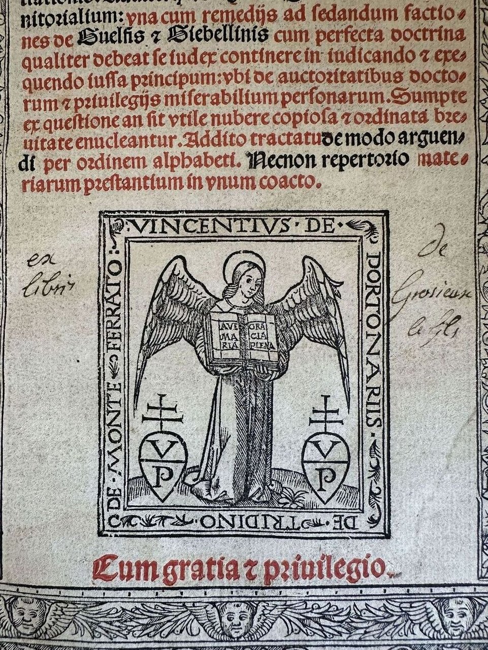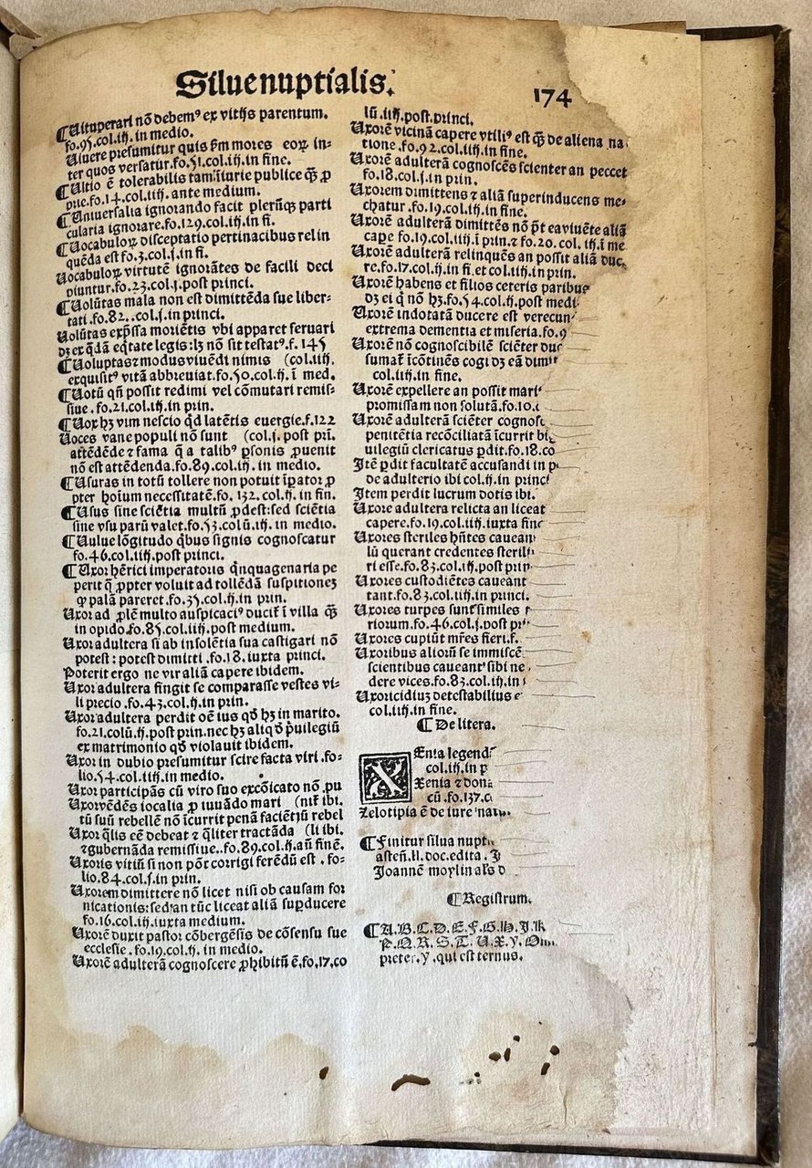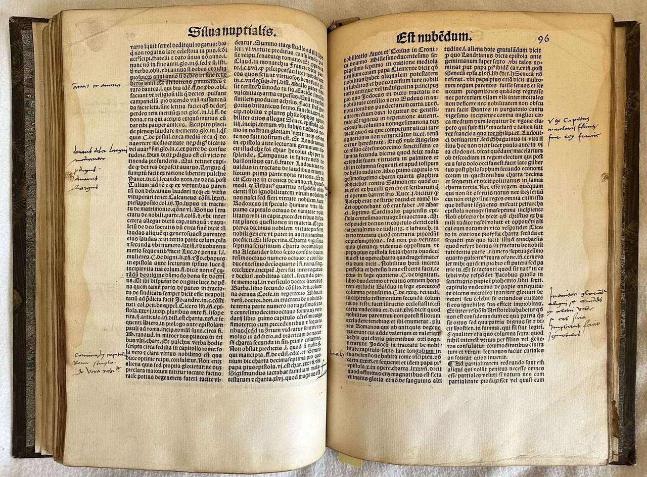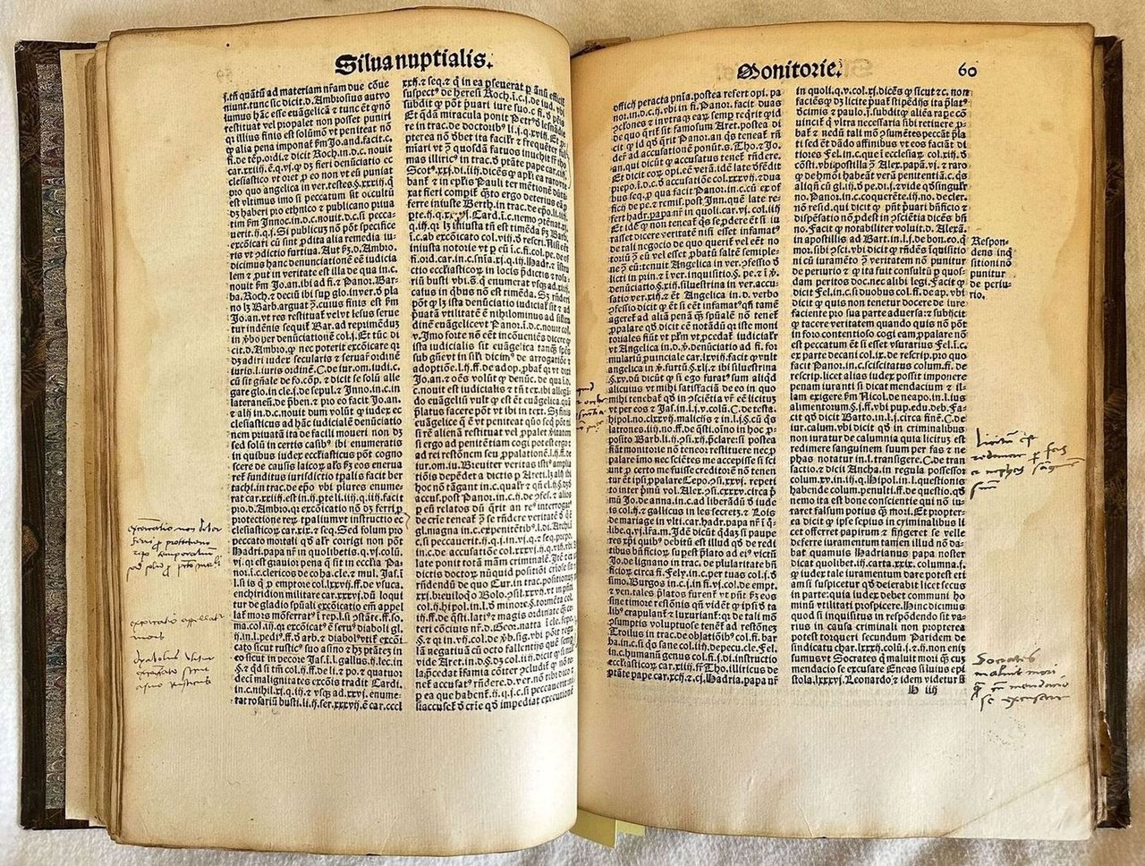 Edizione del 1524 di questo trattato di diritto matrimoniale del giuresconsulto Giovanni Nevizzano (m. 1540) astigiano che compì gli studi a Pavia e Padova e insegnò a Torino. Questa opera, pubblicata per la prima volta nel 1518, è la sua più celebre. E' un trattato in forma di quaestio nella quale l'autore disquisice sull'utilità o meno del matrimonio con una rassegna esaustica dei "fundamenta" che sconsigliano di contrarre il vincolo nuziale in particolare a determinate categorie di persone o che invece incoraggiano a farlo. L'opera costituisce uno dei principali conttributi di matrice giuridica alla "querelle des sexes" rinascimentale sia peer l'argomento sia per il repertorio dei luoghi comuni della misoginia classica e meedievale che N. allega per confermare la "naturale" inferiorità delle donne e dunque la loro auspicabile subalternità agli uomini." (Cfr. Treccani online). "Cette edition et celle de Paris, Viidoue pour Kerver 1521. In 8 goth. sont preferees aux differentes reimpressions qui en ont ete faites a Lyon 1545, 1556 et 1572 in 8 et aussi à Venise en 1570 et 1573 parce que l'on pretend que le texte des ces dernieres a ete altere et que l'on y a aduci les passages contre les femmes" (Cfr. Brunet IV, 47). "Livre bizarre, où l'auterur deroule, avec un serieux soutenu, une erudition facetieuse. Les sarcasmes les plus grossiers contre les femmes emaillent cet ouvrage d'un bout a l'autre, C'est la que l'on trouve que "Dieu ayant formè l'homme, ajourna la creation de la femme, pour s'occuper d'elle en meme temps que des animaux et qu'encore se borna-t-il a faconner son corps; quant a la tete il ne voulut s'en meler et en abandonna l'organisation au diable" (Cfr. Gay III, 1162). Cornice xilografica e marca di Vincenzo Portonari sul frontespizio, stampato in rosso e nero. Ex libris manoscritto di De Grosieux le fils e alcune antiche note manoscritte ai margini. Mancanze all'ultima carta con perdita di testo. In buone condizioni. Copertina in mezza pelle ottocentesca con titolo e decorazioni in oro al dorso in buone condizioni con lievi usure marginali. Legatura in buone condizioni. Pagine in buone condizioni con fioriture. Lievi gore d'umidità marginali. Alcuni segni di tarlo marginali alle ultime due carte. In 8. cm 26,5x18,5. pp. 174 Edition of 1524 of this treaty of marriage right by the juresconsult Giovanni Nevizzano (m. 1540) from Asti that made his studies in Pavia and Padova and teached in Turin. This work, published for the first time in 1518, is his amous work. It is a treaty in form of quaestio in which the author talks about the utility of marriage with a complete list of "fundamenta" (Cfr. Treccani online). "Cette edition et celle de Paris, Viidoue pour Kerver 1521. In 8 goth. sont preferees aux differentes reimpressions qui en ont ete faites a Lyon 1545, 1556 et 1572 in 8 et aussi à Venise en 1570 et 1573 parce que l'on pretend que le texte des ces dernieres a ete altere et que l'on y a aduci les passages contre les femmes" (Cfr. Brunet IV, 47). "Livre bizarre, où l'auterur deroule, avec un serieux soutenu, une erudition facetieuse. Les sarcasmes les plus grossiers contre les femmes emaillent cet ouvrage d'un bout a l'autre, C'est la que l'on trouve que "Dieu ayant formè l'homme, ajourna la creation de la femme, pour s'occuper d'elle en meme temps que des animaux et qu'encore se borna-t-il a faconner son corps; quant a la tete il ne voulut s'en meler et en abandonna l'organisation au diable" (Cfr. Gay III, 1162). Woodcut frame and mark of Vincenzo Portonari in the red and black title page. Handwritten Ex libris of De Grosieux le fils and some antique handwritten notes in the edges. Lackings in the last page with loss of text. In good conditions. Half leather cover of 19th century with gilted title and decorations in the spine in good conditions in the extremities. Binding in good conditions. Pages in good conditions with foxing. light dump stains in the edges. Some worming in the right edges of the last two pages. In 8. cm 26,5x18,5. pp. 174.