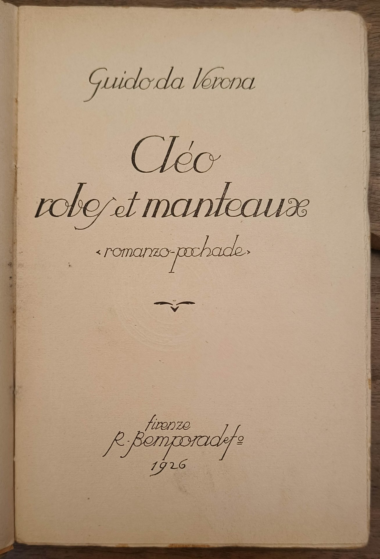 Cléo robe et manteaux, Firenze, Bempoard, 1926. Prima edizione. Cm 19,5. Pp. 221 (3). Legatura in piena pelle scamosciata con laccio. Dedica autografa dell'autore a p. 5 a S.E. Cav. Domenico Aliventi "queste pagine care tenteranno di far sorridere il suo spirito di magistrale acuto e lucente".