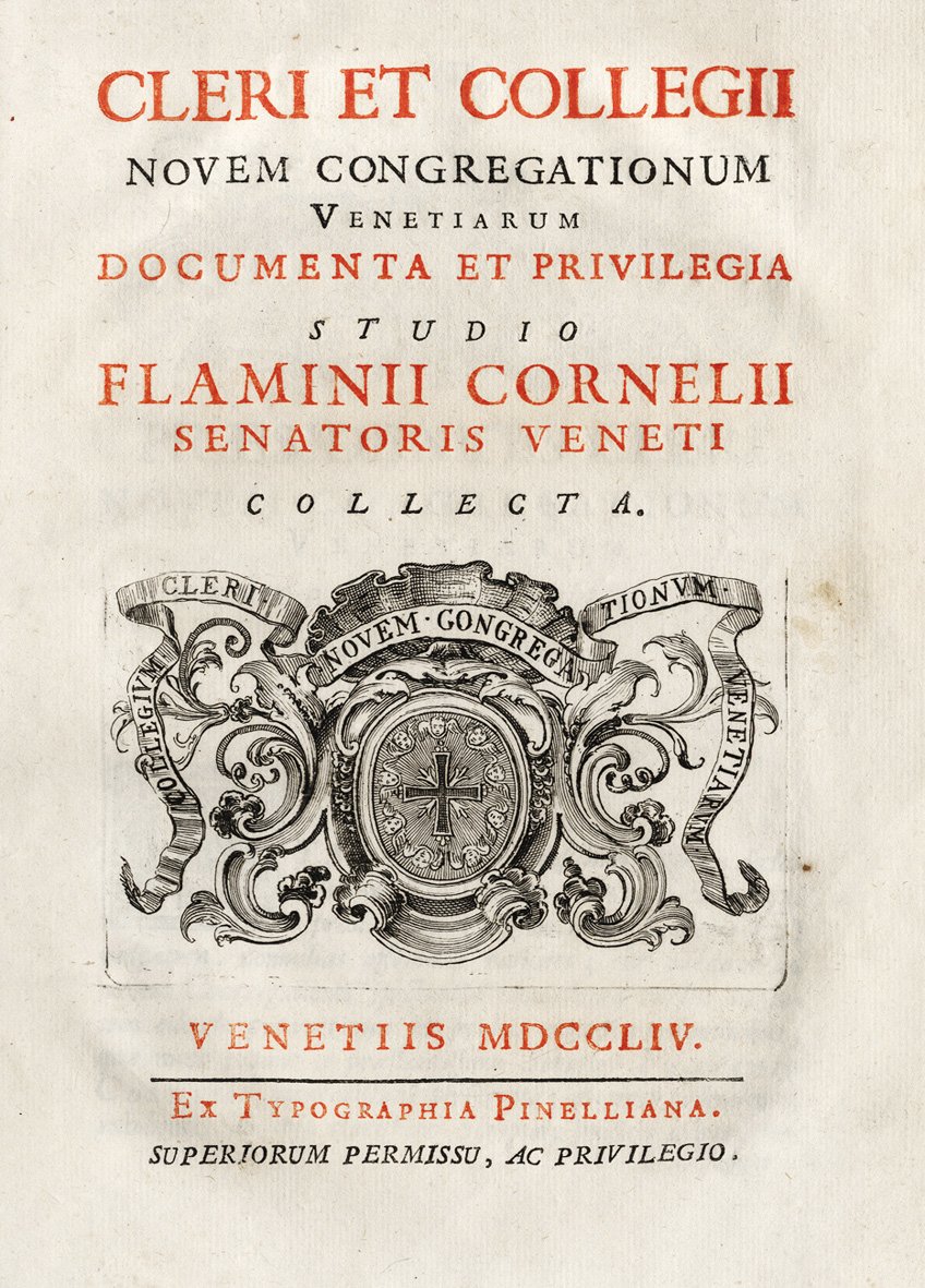 >in-4 (270x195 mm), pp. XVI, 135, (1), legatura cartonato coevo. Frontespizio a stampa rossa e nera con vignetta e testatina incisa in rame alla prefazione, ritratto dell'autore in medaglione a pag. XIV , fregi ed iniziali silografiche, testo su due colonne. Raro volume che raccoglie documenti e privilegi delle nove Congregazioni veneziane (S. Michele Arcangelo, S. Maria, SS. Ermagora e Fortunato, S. Maria Formosa, S. Silvestro, S. Luca, S. Paolo, SS. Canciano e soci, Santiss. Salvatore). Prima edizione a sé, ''accresciuta e illustrata di nuove annotazioni'' (già compresa nel vol. IV delle ''Ecclesiae Venetae'' del medesimo autore, apparse nel 1749). Il Cornaro (latinizzato in Cornelius) fu cultore di cose patrie, autore di molte opere di storia ecclesiastica veneziana, materia nella quale era il più erudito a quel tempo. Esemplare a grandi margini (lieve alone d'umido nelle prime pagine). Cicogna, 125: ''Il Cornaro pose la stessa opera nel tomo IV delle Chiese Venete, ma in questa seconda edizione è accresciuta''.