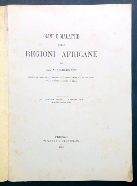 Dal Giornale Medico "Lo Sperimentale", Aprile e Giugno 1885. Firenze, Tipografia Cenniniana, 1885. In 4to, pp. 77 (con Conclusioni, Indice e "Altre principali pubblicazioni dell'Autore"), bross. orig. in carta gialla. Riportiamo i capitoli dall'Indice (senza i sotto capitoli): Capitolo I Generalità geografiche e climatologiche, Capitolo II Distribuzione delle malattie nel continente africano, Capitolo III Le malattie proprie della razza nera e dell'Africa, Capitolo IV Le principali malattie degli Europei in Africa, Capitolo V Igiene pubblica e privata. Siamo agli albori del colonialismo italiano in Africa (la prima colonia risale infatti al 1882 con l'acquisizione della baia di Assab). Non comune. Imperfezioni alla brossura, interno con qualche aloncino giallo ma in ottimo stato. .