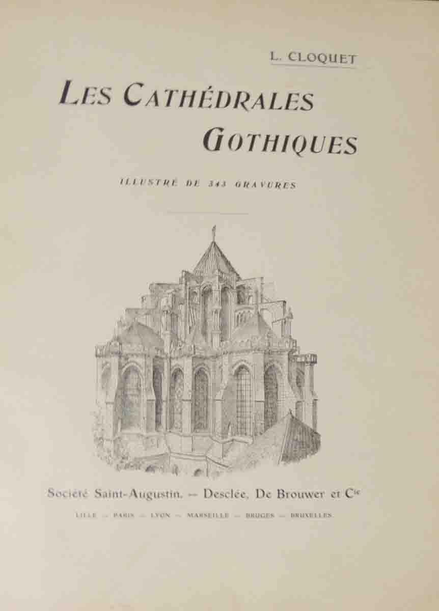 Louis Cloquet, Les Cathédrales Gothiques, Société Saint-Augustin – Desclée, De Brouwer et Cie, Lille 1914, pp. 415, ill. b.n., cm 33, legatura in tutta tela con titoli in oro su tassello in pelle al dorso. Leggere tracce d’uso, minime fioriture, lieve brunitura della carta, per il resto ben conservato.