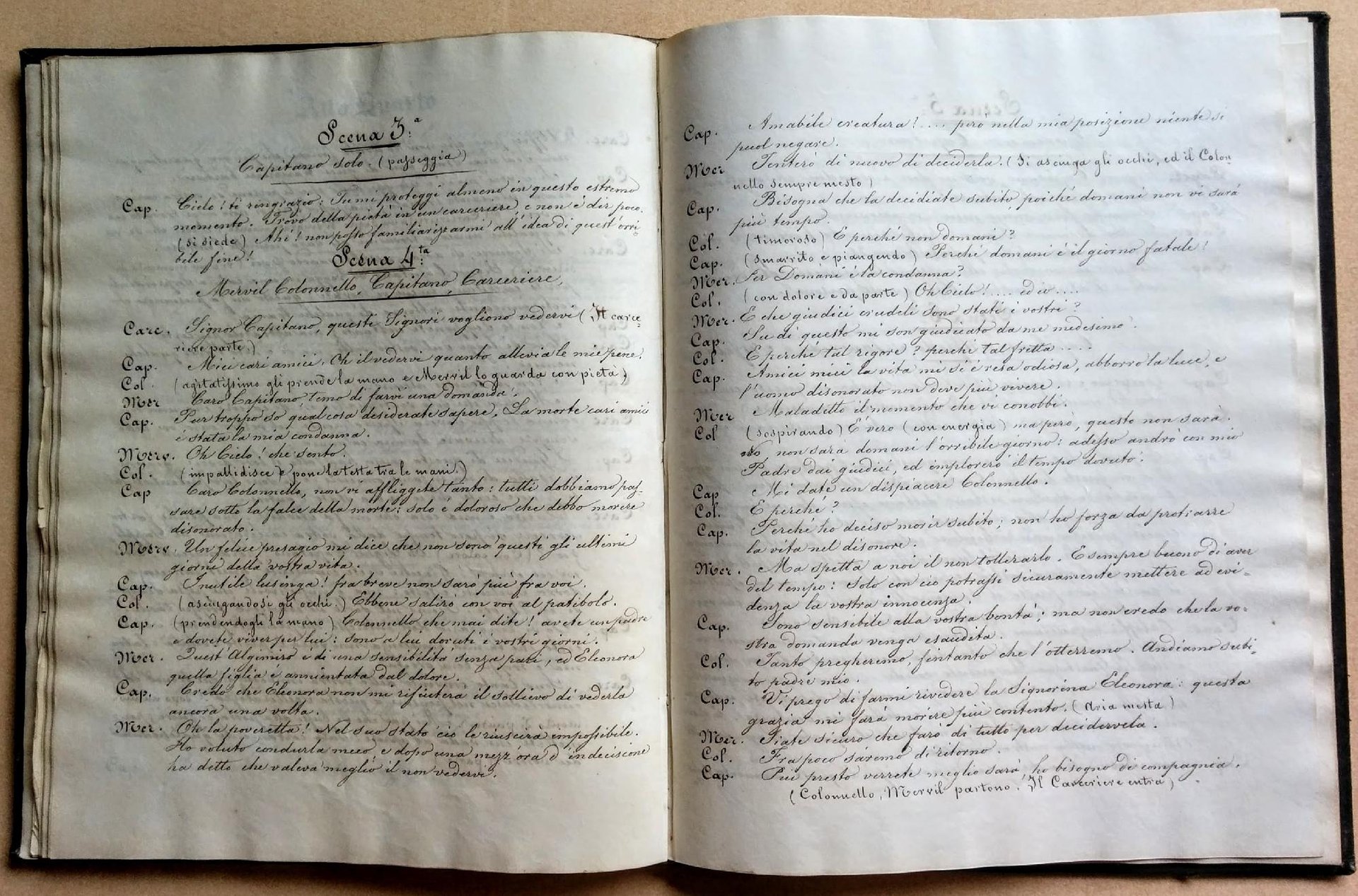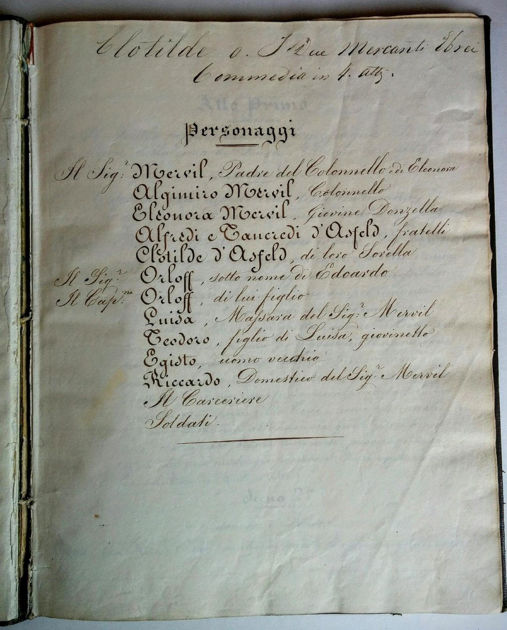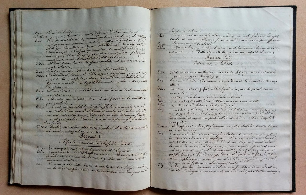 >in-4, ff. 42, vergati in un'elegate e chiara grafia della prima metà del XIX sec., leg.d'amatore in p. pelle coeva, piatti con bordura floreale in oro, dorso liscio con filetti dorati, sguardie in seta. Commedia in quattro atti in prosa, di complessive 14 scene, i cui protagonisti sono il colonnello Mervil e la sua famiglia. Non è stato possibile purtroppo identificare l'autore della pièce, che non compare, inoltre, neppure tra i titoli del Melzi. Manoscritto inedito, in perfetto stato di conservazione. Non citato in alcuna bibliografia.