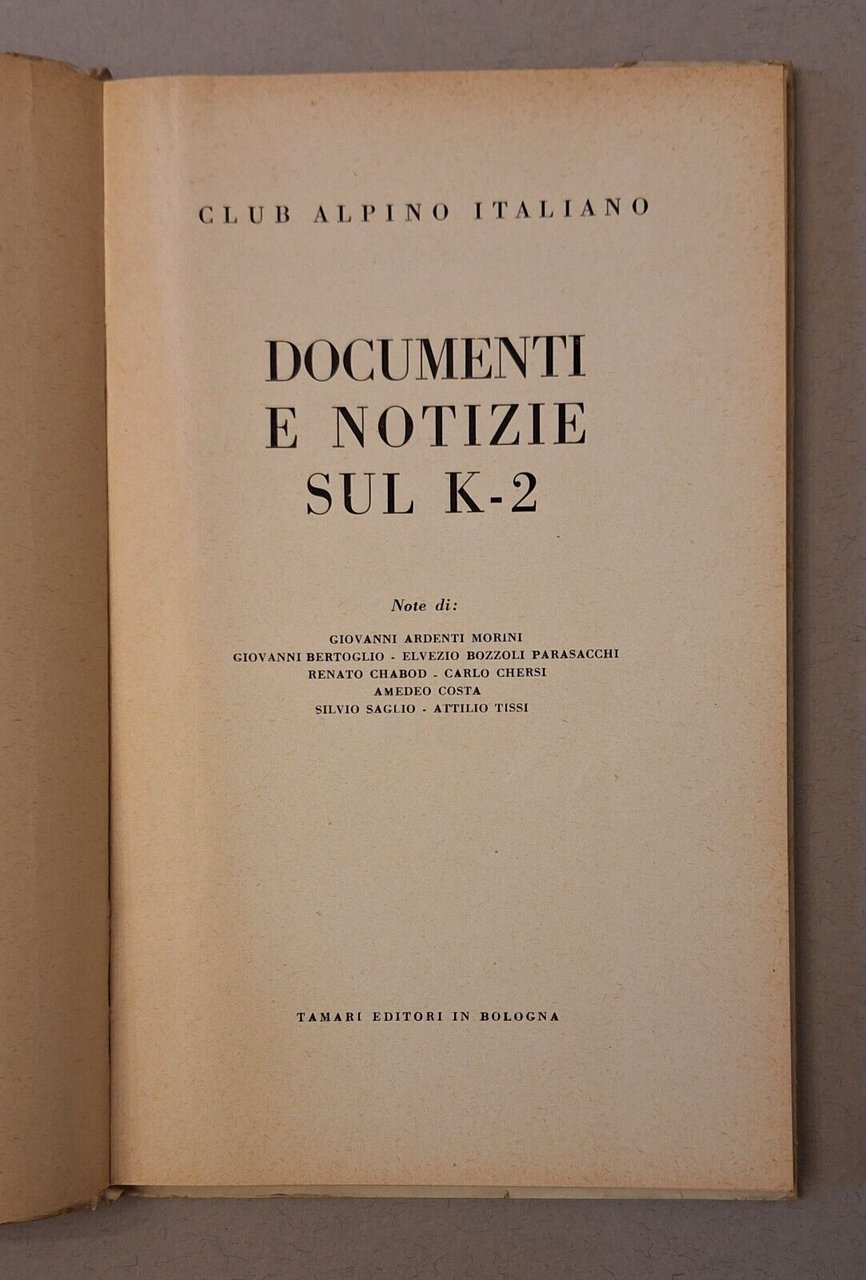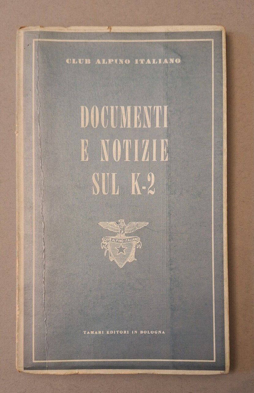 CLUB ALPINO ITALIANO DOCUMENTI E NOTIZIE SUL K2 TAMARI EDITORI 1956 In 8° piccolo, legatura editoriale, copertina illustrata, ill. in b/n.In ottime condizioni, lievissimi segni alla copertina.