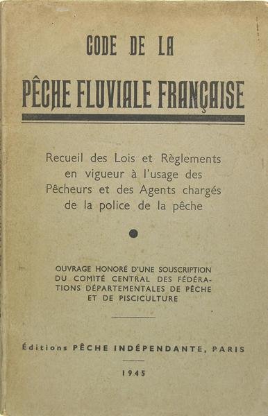 Editions Pêche indépendante, Paris 1945. In/8, broché 95 p. Tache sur le coin supérieur des 5 dernières pages. Recueil des Lois et règlements en vigueur à l’usage des pêcheurs et des agents chargés de la police de la pêche.