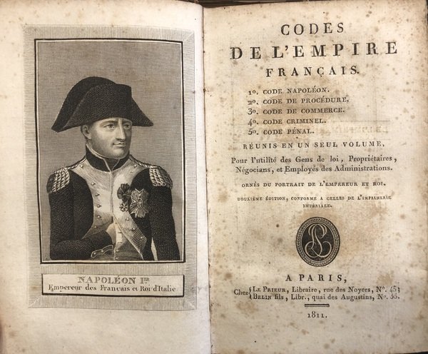 Codes de l'Empire Fran�ais - Code NapolŽon; Code de ProcŽdure; Code de Commerce; Code Criminel; Code PŽnal (rŽuinis en un seul volume). Bella incisione di Napoleone in antiporta, in 16¡ (cm 18). Legatura originale in mezza pelle, con piatti cartonati, titoli e fregi oro al dorso, pp 696. Sulle pagine alcune fioriture e bruniture tipiche della carta francese dell'epoca, senza mai compromettere il testo.