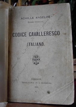 Volume in 8, brossura editoriale, titolo al piatto ed al dorso, sguardie, occhiello, frontespizio, XXVII, 188 pp., bianca finale. Prima, non comune edizione, del pi famoso codice cavalleresco italiano dell' ottocento, compilato dal generale Achille Angelini, aiutante di campo effettivo di Vittorio Emanuele II; contiene, nella sua prima parte, il Codice del Duello ed espone i doveri ed i diritti del gentiluomo; nella seconda, la costituzione ed il funzionamento dei Tribunali d' onore. Ricco di numerose ed utili nozioni, sul diritto, l'onore, gli strumenti, le ritualit; con in appendice le Norme ed i Verbali per avviare o risolvere una questione d' onore, oltre ad un elenco di vari gentiluomini che sottoscrissero e avvalorarono l' opera. Firma di appartenenza al frontespizio ed al piatto anteriore della brossura, ed una interessante nota manoscritta che attesta la difficile reperibilit della presente edizione. Lievi mende, in buono stato di conservazione.