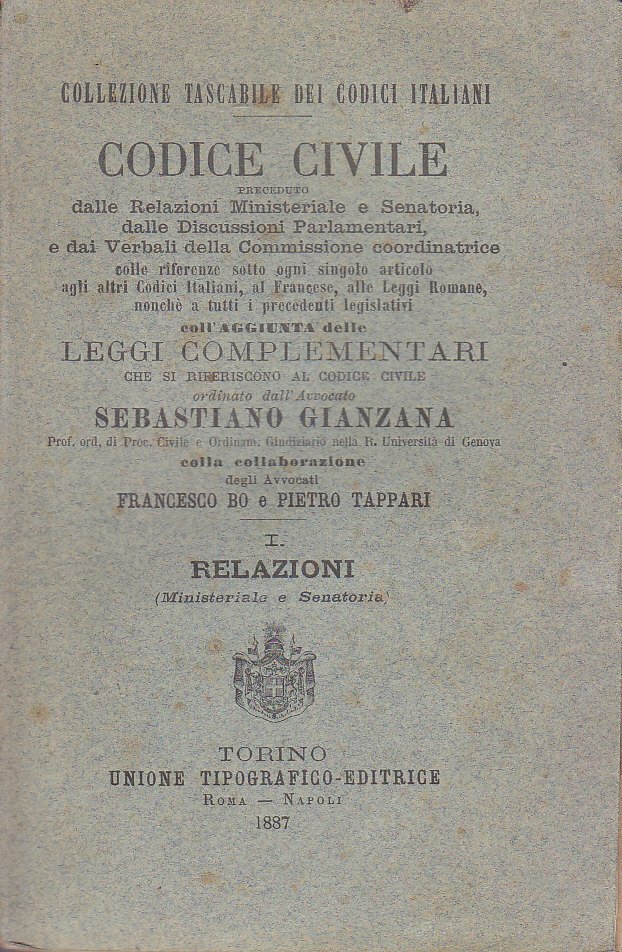 Codice Civile aggiunta leggi complementari volume I di Gianzana 1887 UTET libro