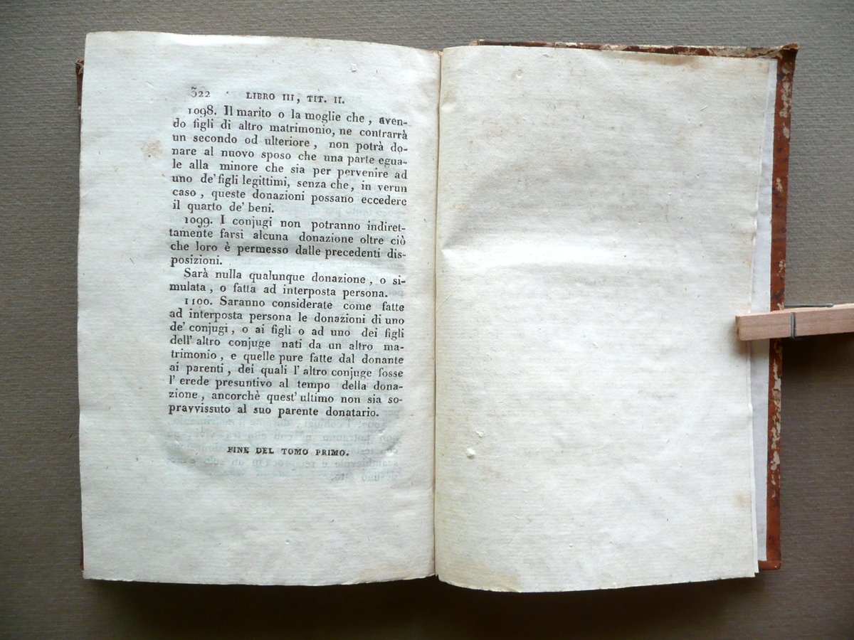 Codice civile, Codice Civile di Napoleone il Grande pel Regno d'Italia quarta edizione originale ed officiale tomo I Dalla Reale Stamperia, Milano 1806; cm 15x10; pp. XXX-322; legatura d'epoca in mezza pelle con titolo e fregi impressi in oro al dorso (dorso quasi completamente mancante, vedi foto e descrizione); piatti marmorizzati. Solo volume I. Condizioni di conservazione Esemplare in condizioni discrete con tracce d'uso e leggeri segni del tempo, dorso quasi completamente mancante del rivestimento in pelle (vedi foto), ma esemplare compatto; piatti con qualche minima abrasione e mancanza. Interni buoni con alcune lievi bruniture e pochi leggeri aloni. Solo tomo I. SETT150.L14435 N P
