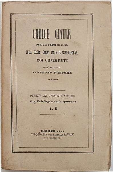 Codice Civile per gli Stati di S.M. il Re di Sardegna coi commenti dell'Avvocato Vincenzo Pastore da Cuneo. Tomo I. Dei privilegi e delle ipoteche.