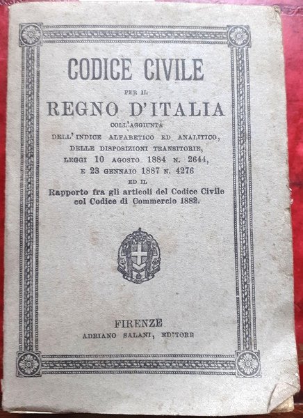 CODICE CIVILE PER IL REGNO D'ITALIA, coll' aggiunta dell' Indice alfabetico ed analitico, delle disposizioni transitorie, leggi 10 agosto 1884 n. 2644, e 23 gennaio 1887 n. 4276 ed il Rapporto fra gli articoli del Codice Civile col Codice Commerciale 1882.