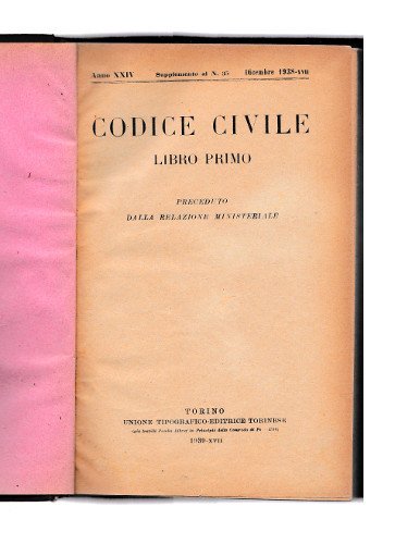 Legatura in tela (cm 19x12). 6 libri in un solo volume. Libro primo delle persone pag. 211. Libro delle successioni per causa di morte e delle donazioni pag.186. Carta del lavoro e libro delle proprietà pag.143. Libro della tutela dei diritti pag.125. Libro delle obbligazioni pag. 265. Libro del lavoro pag. 177. -- Buono stato.