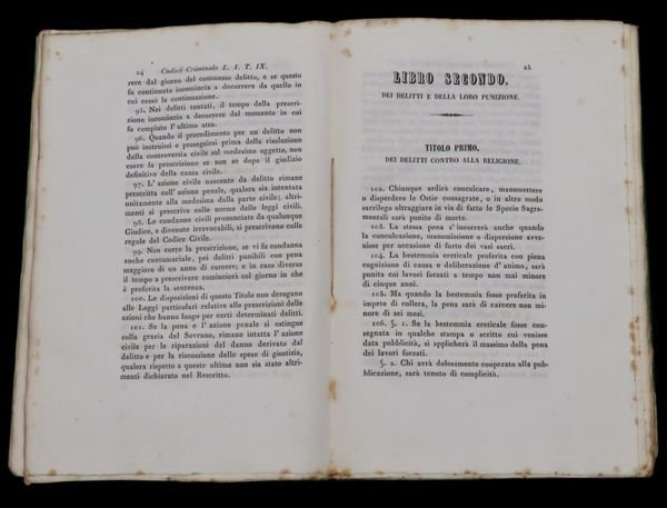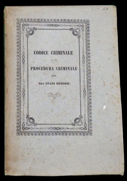 In 8° grande; (8), 140 pp, 128 pp. Brossura editoriale con titolo entro ricca cornice ornata che si presenta sia al piatto anteriore che posteriore. Esemplare in ottime condizioni di conservazione, ancora in barbe e con la parte della Procedura ancora a fogli chiusi. Opera non comune da reperirsi completa della sua brossura editoriale ed in queste ottime condizioni di conservazione. Prima edizione del Codice Criminale e di procedura Criminale per gli Stati Estensi promulgato dal Duca Francesco V Ferdinando Geminiano d'Asburgo-Este (Modena, 1º giugno 1819 Vienna, 20 novembre 1875) appartenente alla linea Asburgo-Este, figlio maggiore del duca Francesco IV d'Asburgo-Este e della principessa Maria Beatrice di Savoia (1792-1840) che fu l'ultimo sovrano regnante del Ducato di Modena e Reggio. Il Duca, già un anno dopo la soppressione dei moti risorgimentali del 1848, decise di mettere mano ad una profonda riforma legislativa e così, nel 1849, incaricò unapposita commissione per cercare di portare il sistema legislativo del ducato ad una codificazione legale a livello degli altri stati della penisola. La Commissione lavorò con grande attenzione ed finì i suoi lavori nella seconda metà del 1855 dando alla luce 4 codici (quello da noi presentato è quello criminale) che fecero, effettivamente del ducato estense uno Stato dalla legislazione avanzata. Un nuovo periodo di relativa tranquillità consentirono a Francesco V di riprendere la strada intrapresa delle riforme e tra le principali ricordiamo la legge sul reclutamento militare del 3 aprile 1849, la legge sulla costituzione della milizia di riserva del 10 aprile 1849; la legge del 24 febbraio 1851 con la quale sono stabilite le relazioni tra Stato e Chiesa; il Regolamento di Polizia del 1854, redatto dal Ministero del Buon governo che affidava la competenza a giudicare e a punire agli stessi organi di polizia al fine di garantire una capacità di intervento rapida, efficace e mirata; la legislazione speciale d'emergenza, per quanto concerne la materia dei delitti contro l'ordine pubblico e contro la stabilità del potere e del sistema politico, compendiata e razionalizzata nel decreto del 4 gennaio 1854, caratterizzata da tecniche di giudizio semplificate, con lo scopo di ottenere interventi. Il codice regolarizzava tutto il sistema dei reati del ducato con capitoli dedicati: Del delitto; Delle pene; Degli effetti delle pene; Dei recidivi; Dei delitti contro la religione; Dei delitti di lesa Maestà e di alto tradimento; Delle società segrete; Della corruzione; Della concussione; Dei delitti degli avvocati, dei procuratori, dei difensori e dei sollecitatori; Del Duello; Dellaborto; Dellomicidio volontario; Dellomicidio involontario; Delle Minacce; Dello stupro, del ratto violento, e del leoncino; Del furto; Delle truffe, dello stellionato e di altre specie di frode; Dellusura e di altri contratti illeciti; Delle prove etc. Rif. Bibl.: IT\ICCU\MOD\0193927.