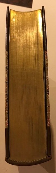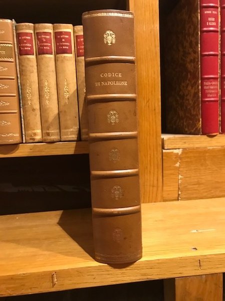 Legatura mezza pelle a fascia larga angoli in pergamena. Doppio tassello nervi e stemma napoleonico in oro sul dorso. Rilegatura Rigoldi Monza