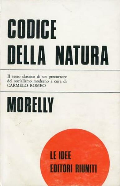 200 p. ; 19 x 12 cm. Le idee, 106. Di Morelly se ne ignora il nome, e su di lui non si dispone di dati biografici certi. Oltre a due opere sui principi dell’educazione, gli vengono attribuite «Le Prince, ou Traité des qualités d’un grand roi et système d’un sage gouvernement» (1751); «Le naufrage des îles flottantes ou la Basiliade» (1753) e soprattutto il «Code de la nature, ou le véritable esprit de ses lois, de tous temps négligé ou méconnu» (1755). In quest'ultima opera Morelly sviluppa una teoria politica che, almeno nelle premesse, è in larga parte sovrapponibile a quella di Rousseau. Le idee di Morelly ispirarono il «Manifeste des plébéiens» di Babeuf (che nel processo subito per la «Congiura degli eguali», nel 1796, si dichiarò un seguace del «Codice della natura», all’epoca e per lungo tempo ritenuto opera di Diderot) e influenzarono gran parte del socialismo utopistico. Titolo originale dell'opera: «Code de la nature, ou Le véritable esprit de ses lois, de tout temps négligé ou méconnu». Traduzione, introduzione e cura di Carmelo Romeo. Brossura editoriale, coperta in cartoncino flessibile plastificato lucido e colorato (b/n e rosso), titolo impresso al piatto e al dorso. Qualche segno del tempo alla coperta e al taglio (ingiallimento della carta), alcune sottolineature a penna rossa, per il resto esemplare integro. Codice libreria 7141.
