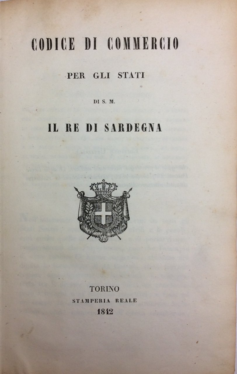 In-8 p. (mm. 202x128), mz. pergam. coeva, titolo oro su tassello al dorso, pp. (8),228, stemma sabaudo al frontespizio. Diviso in quattro libri: Del commercio in generale - Del commercio marittimo - Dei fallimenti e delle bancherotte - Della giurisdizione commerciale. Ben conservato.