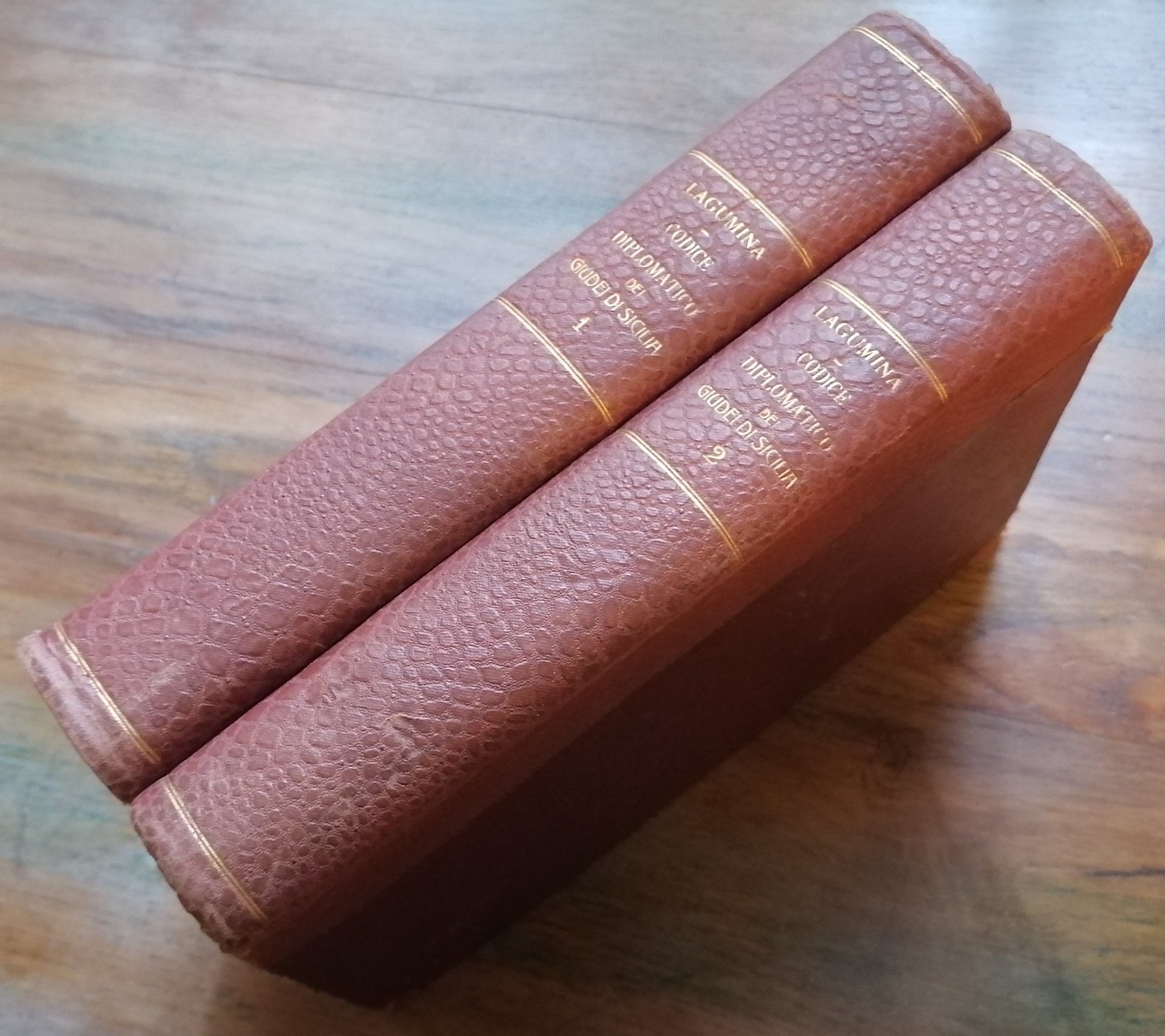 (Sicilia giudaica; Ebraismo siciliano; Medioevo; Rinascimento) "Documenti per servire alla storia di Sicilia pubblicati a cura della Società Siciliana per la Storia Patria. Prima serie - Diplomatica, vol. VI e vol. XII". Due volumi in 8° grande (cm 27 x 19,5), legatura coeva in mezza percallina amaranto con punte, al dorso titoli e filetti impressi in oro, pp. XV,(1),616,(2) ; (4),570,(2). Corposa raccolta di documenti relativi alla storia delle comunità ebraiche di Sicilia dal Medioevo fino all'espulsione del 1492. Primo e secondo volume della parte prima dove gli autori hanno raccolto i documenti diplomatici dell'autorità regia o viceregia. Una seconda parte fu pubblicata nel 1895 con i documenti riguardanti singole città. All'interno una data all'occhiello del primo volume, cerchietti a penna evidenziano il numero in cifre romane di alcuni documenti nel secondo volume. Lievi e marginali segni del tempo ai piatti delle legature, peraltro ottimo stato di conservazione. Edizione originale.