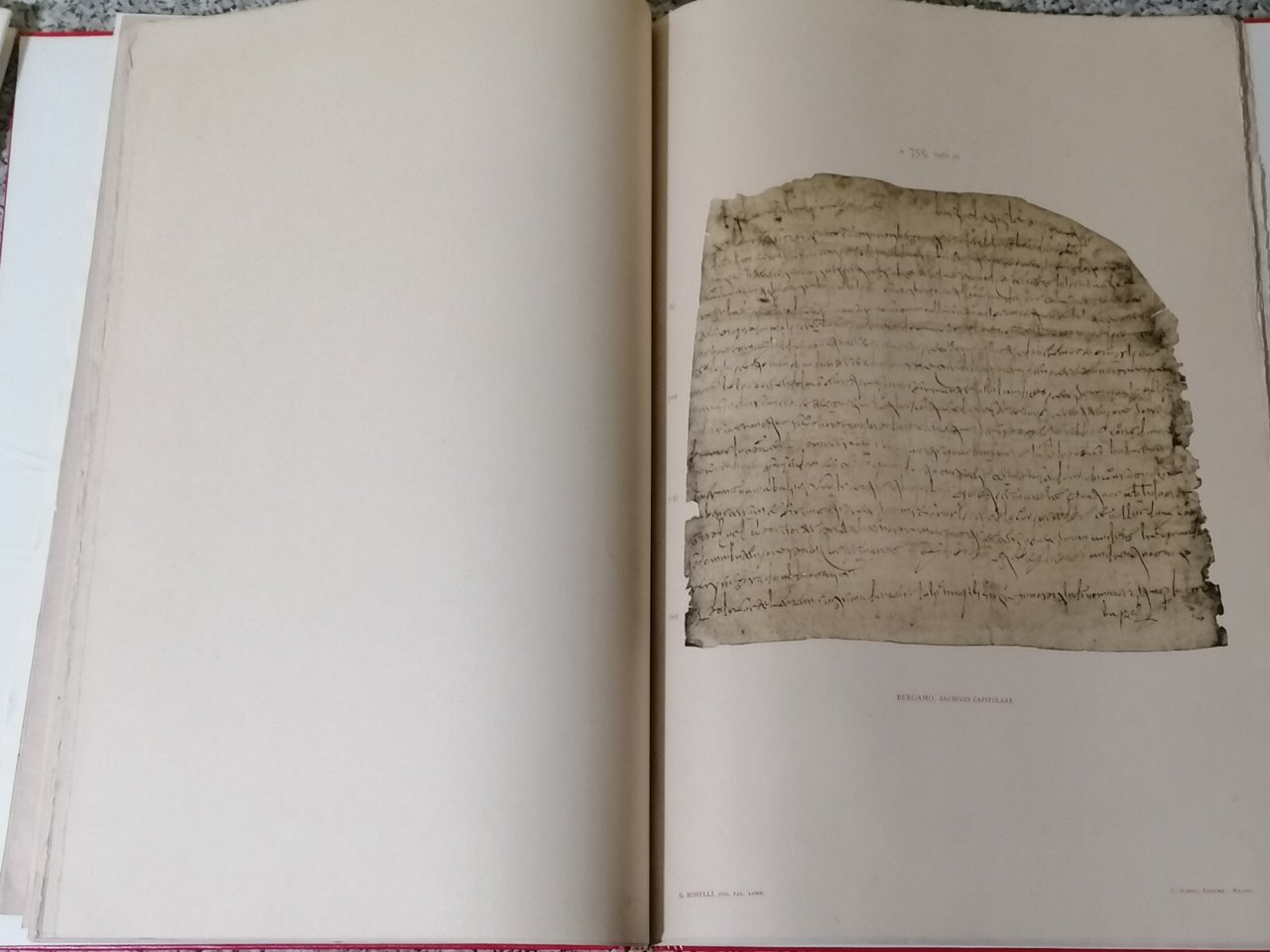 Giuseppe Bonelli (cur.), Codice paleografico lombardo. Riproduzione in eliotipia e trascrizione diplomatica di tutti i documenti anteriori al 1000 in Lombardia Milano, Hoepli, Prima edizione 1908. Autore: Giuseppe Bonelli (cur.) Editore: Hoepli Anno di pubblicazione: 1908 Pagine: 60 circa Formato: rilegato a tutta pelle, grande formato cm 60 x 41 Descrizione Rarissimo, unica copia al mondo in commercio. Autentica rarità bibliografica. Condizioni del libro Buone condizioni generali