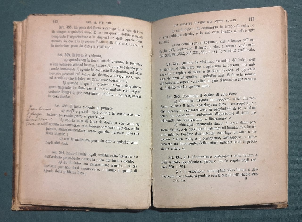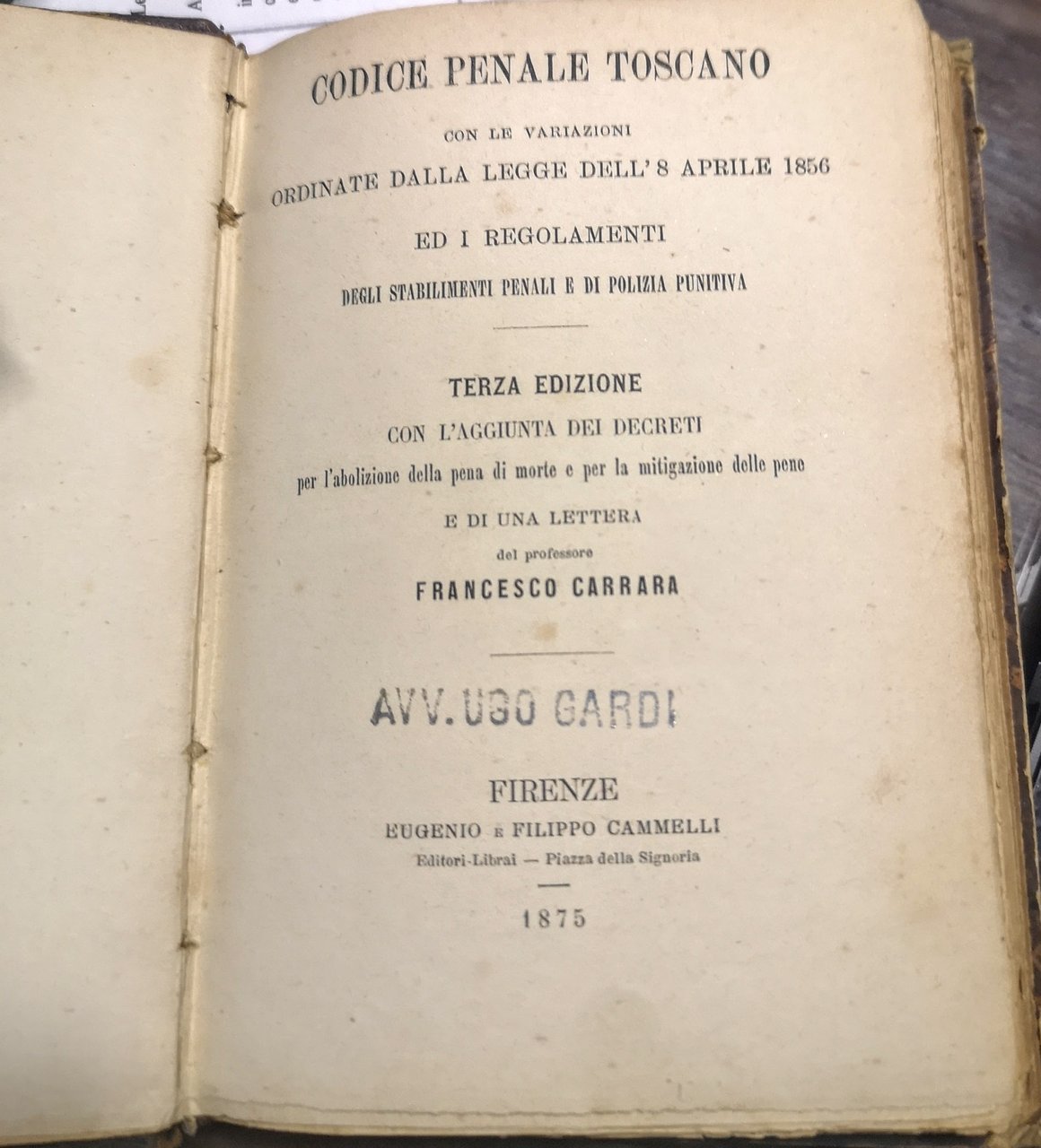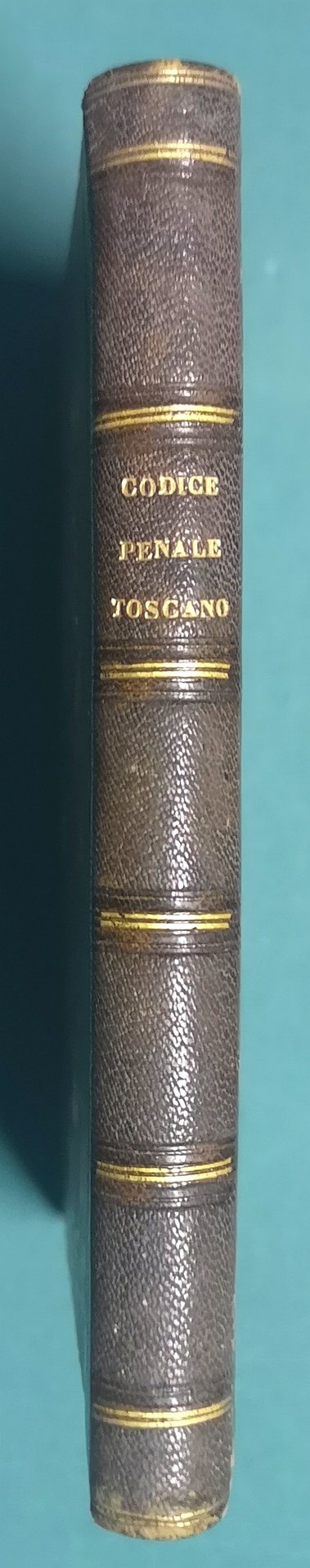 >in-16, pp. (8), IV, 239, legatura coeva in m. marocchino bruno, titolo e filetti in oro al dorso. Terza edizione, ultima e più completa, del Codice Penale Toscano con varie aggiunte, tra le quali le leggi sulla abolizione della pena di morte. L'opera fu ristampata da Cammelli su consiglio di Carrara, che era fermamente convinto che il nuovo codice Penale Italiano si sarebbe dovuto ispirare principalmente al Penale Toscano, che già ai suoi tempi "era divenuto rarissima merce". Buon esemplare, sporadiche arrossature e note ms. marginali.