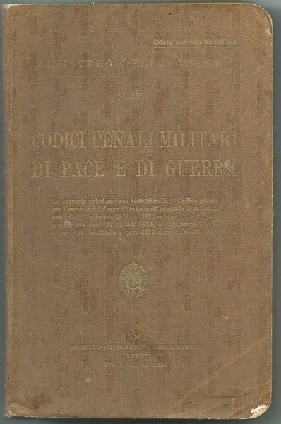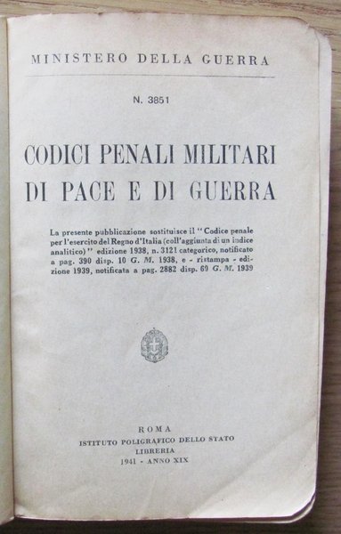 La presente pubblicazione sostituisce il "Codice Penale per l'Esercito del Regno d'Italia (coll'aggiunta di un indice analitico)" edizione 1938, n.3121 categorico, notificato a pag. 390 disp. 10 G. M. 1938, e - ristampa - edizione 1939, notificata a pag. 2882 disp. 60 G. M. 1939. Editore Istituto Poligrafico dello Stato - Roma, 1940. Brossura editoriale con lievissime tracce d'uso e timbro al risguardo "Base Militare N.9 - Ufficio Personale". 12x18; pp.506. Buonissimo stato. ,