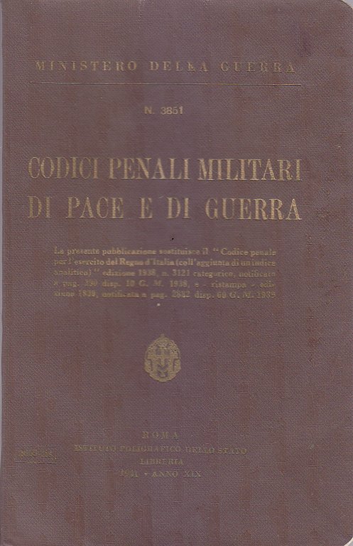 CODICI PENALI MILITARI DI PACE E GUERRA 1941 Istituto Poligrafico Stato libro