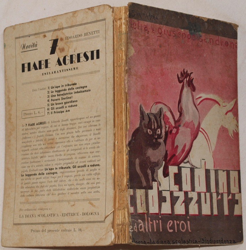 In 8. Dim. 24,5x17 cm. Pp. 89+(2). Bel volume del 1938, una raccolta di novelle di Clelia e Giuseppe Sandrone che hanno come protagonisti degli animali. All'interno sono presenti 12 planches fuori testo illustrate da Santandrea. Bella copertina editoriale illustrata. In discrete condizioni. Copertina editoriale illustrata in discrete condizioni generali con usure e parti mancanti ai margini e dorso. Legatura in discrete condizioni con rotture. All'interno le pagine si presentano in ottime condizioni con rare fioriture. Beautiful volume of 1938, a collection of short novels by Clelia and Giuseppe Sandrone which have as main carachters animals. Inside there are 12 out of the text planches illustrated by Santandrea. Beautiful editorial illustrated cover. In fair conditions. Editorial illustrated cover in fair general conditions with wearings and missing parts in the edges and spine. Binding in fair conditions with cracks. Inside pages are in good conditions with occasional foxings.