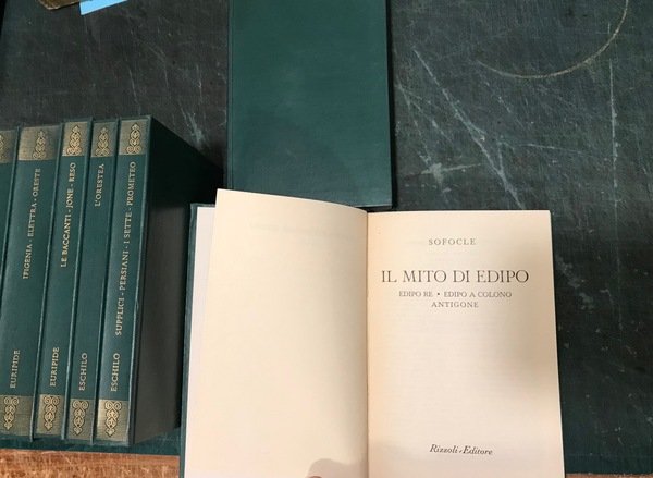 BIBLIOTECA UNIVERSALE RIZZOLI. DI EURIPIDE: LE FENICIE, LE SUPPLICI, ERACLE, GLI ERACLIDI#@59! LE TROIANE, ECUBA, ANDROMACA, ELENA#@59! IFIGENIA, ELETTRA, ORESTE#@59! LE BACCANTI, JONE, RESO#@59! DI ESCHILO: L'ORESTEA#@59! SUPPLICI, PERSIANI, I SETTE, PROMETEO#@59! DI SOFOCLE: IL MITO DI EDIPO#@59! AIACE, ELETTRA, TRACHINIE, FILOTTETE. LIEVI ABRASIONI AL COFANETTO, MOLTO BUONO NEL COMPLESSO LO STATO DELL'OPERA. PAGG. CA. 350 CADAUNO TELA CERATA EDITORIALE MIS VOLUMI: MM 155X105 MIS COFANETTO: 111X160X190