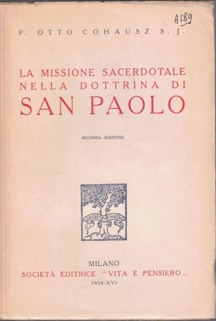 P. Otto Cohausz S. J., La missione sacerdotale nella dottrina di San Paolo, prima traduzione italiana di P. Giuseppe Marzorati, Società Editrice Vita e Pensiero, Milano 1938, seconda ed., pp. X, 306, cm 20, br. ed. Segnatura di classificazione in caratteri minuti a margine di prima di copertina e frontespizio e su un piccolo talloncino di carta applicato al dorso. Leggere tracce d’uso alla brossura, uniforme brunitura della carta, per il resto molto ben conservato. Intonso.