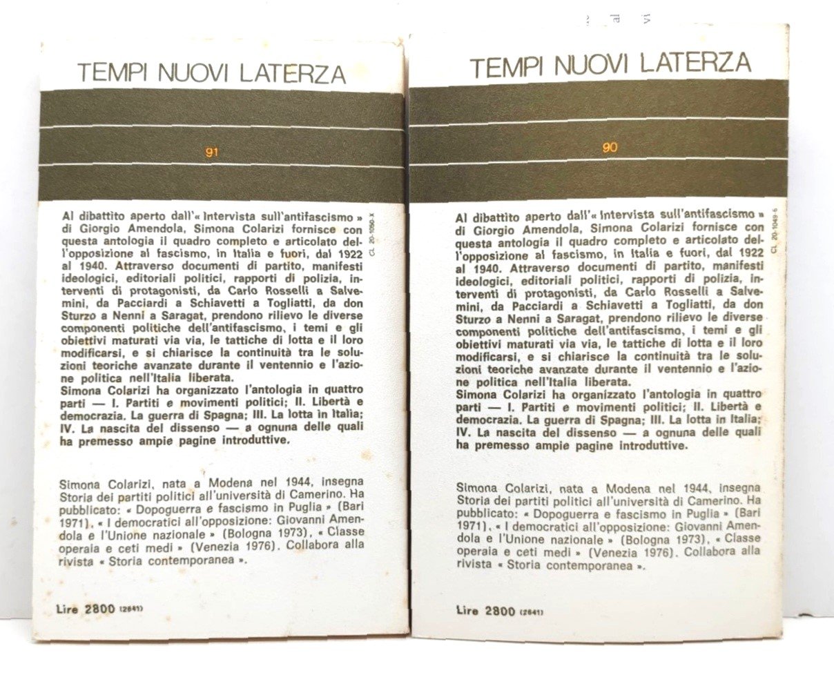 Colarizi L'Italia antifascista del 1900 dal 1922 al 1940 2 volumi Tempi Nuovi Laterza 1976