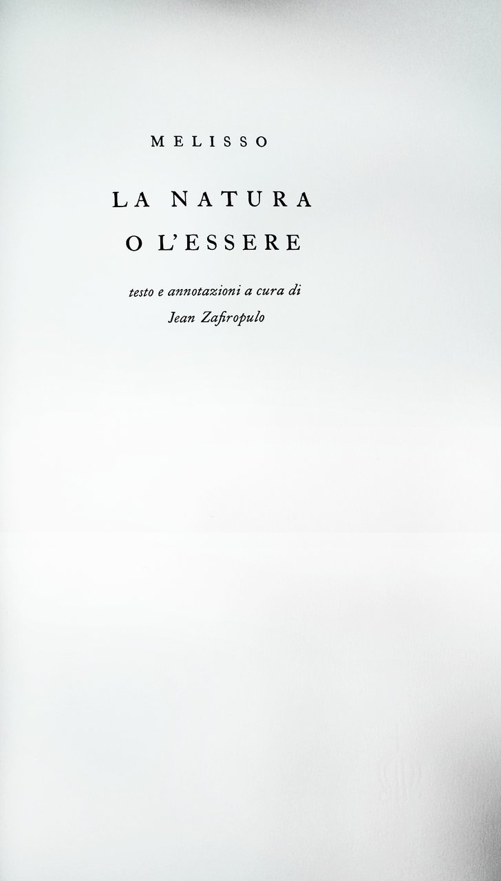 In-4 gr., 8 volumi, legatura in brossura editoriale, custodia e astuccio in cartonato. Edizione bilingue, greca e italiana. Il testo greco è stampato sia in maiuscolo che in minuscolo. Offriamo la collezione completa, così composta: 1°) EMPEDOCLE "La natura", pp. 102,(6). - 2°) DIOGENE DI APOLLONIA "La natura", pp. 37,(7). - 3°) EMPEDOCLE "Il poema delle purificazioni", pp. 57,(7). - 4°) PARMENIDE DI ELEA "Il poema", pp. 76,(6). - 5°) MELISSO "La natura o l'essere", pp. 47,(7). - 6°) ZENONE D'ELEA "La natura", pp. 42,(6). - 7°) PITAGORA "I versi d'oro", pp. 47,(7). - 8°) ANASSAGORA "La natura", pp. 52,(6).Bella edizione talloniana in tiratura limitata, stampata su carta Velina Magnani (ad eccezione del volume di Pitagora, stampato su Carta di Amalfi). In ottimo stato.