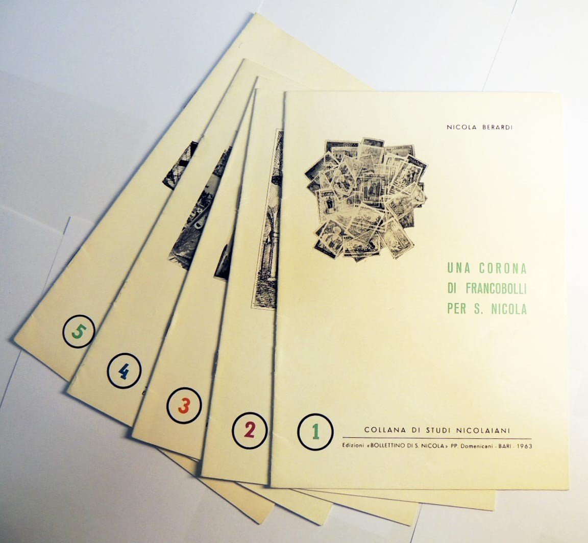 Collana di Studi Nicolaiani, 5 numeri monografici , 1963-1967, Edizioni Bollettino di S. Nicola pp. Domenicani, Bari. Il lotto comprende: Nicola Berardi, Una corona di francobolli per S. Nicola (n.1, 1967), pp. 14, ill. b.n., cm 22 - Francesco Babudri, La cripta di San Nicola di Bari nei suoi alti valori di storia e d’arte (n.2, 1963), pp. 22, ill. b.n., cm 22 - p. Armando o.p., La basilica di San Nicola di Myra (n. 3, 1964), pp. 17, ill. b.n., cm 22 - Francesco Babudri, San Nicola di Bari e il suo patronato sul mare nella storia e nel folklore internazionale (n.4, 1964), pp. 22, ill. b.n., cm 22 - Nicola Pascazio, Tre lustri di attività dei padri domenicani subentrati nel 1951 al glorioso secolare capitolo nicolaiano (n. 5, 1967), pp. 15, ill. b.n., cm 23. Perfetti.