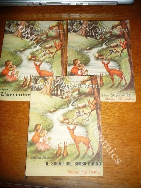 DESCRIZIONE: Vengono proposti 3 volumetti della serie" VOCI DI PRIMAVERA" ?Edizioni “LA FONTE” 1949: - L’Avventura di Biribì (Eugenia Gaziani Camillucci) - Le strabilianti avventure del pennino Totò (Maria Cariati Dose) - Il sogno del bimbo buono (Agostino Massone) Vol. di circa pp. 16 cadauno ill. b/n n.t. CONDIZIONI DELL'OGGETTO: Ottime/Perfette. Timbro d'appartenenza all'antiporta. Potete vedere comunque le condizioni con le foto a fine descrizione. PESO/WEIGHT: 40 g without package