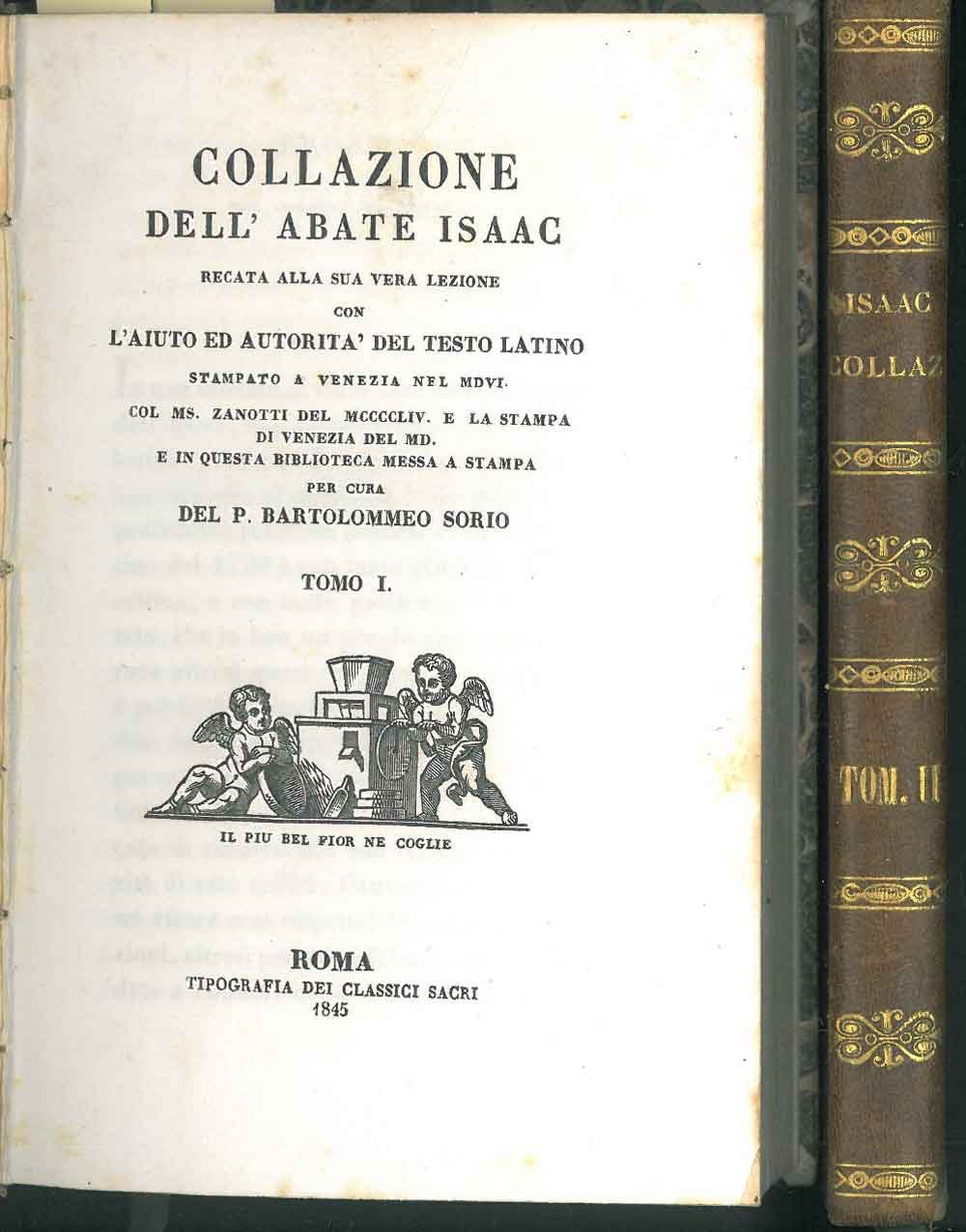 Collazione dell'abate Isaac recata alla sua vera lezione con l'aiuto e l'autorità del testo latino stampato a Venezia nel 1506 col ms. Zanotti del 1454 e la stampa di Venezia del 1500 e in questa biblioteca messa a stampa per cura del p. Bartolomeo Sorio