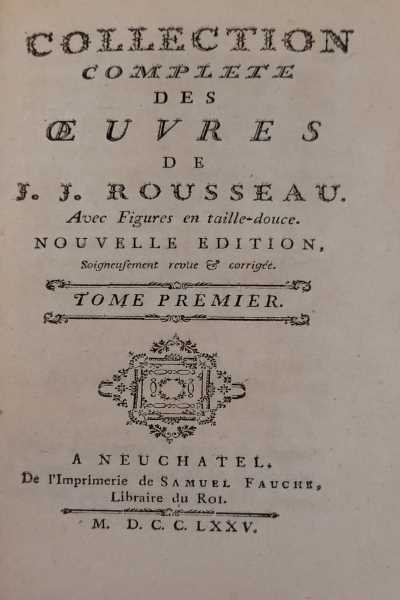 11 volumi. Legatura coeva in cattive condizioni: legatura in piena pelle con fregi dorati e titoli su tasselli ai dorsi, molto compromessa da mancanze,ai dorsi e ai piatti, tarli ai dorsi, alle cerniere e ai piatti, e tagli alle cerniere. I tarli spesso, dalle cerniere e dai piatti, hanno esteso i loro danni anche ai fogli di guardia e alle prime ed ultime cc bianche (al Tomo VIII coinvolta anche la Planche in antiporta). Tagli rossi con tracce di polvere. Le carte di tutti i volumi si presentano ben conservate, con rare fioriture e irregolari bruniture che coinvolgono in maniera più o meno intensa singoli quaderni sparsi in tutti i volumi. Segnaliamo solo al Tomo VIII (peraltro il più estesamente brunito) una sottile gora di umidità al margine esterno delle cc da Bb1 alla fine del volume e al Tomo II la legatura aperta in corrispondenza dell'inizio di Du Contract Social, con anche il frontespizio del saggio parzialmente staccato (c N1). Piccole mancanze senza perdite di testo agli angoli inferiori esterni di singole cc (Tomo II D1; Tomo V M4; Tomo X H2)