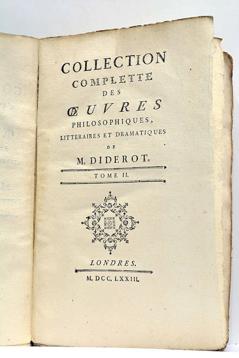 5 volumes. 2 feuillets. 604 pages. 1 tableau dépliant hors-texte + 2 feuillets. 4 pages. 4 pages. 472 pages. 8 gravures hors-texte + 2 feuillets. 627 pages. + 2 feuillets. 428 pages. + 2 feuillets. 7 pages. CXII. 412 pages. 1 gravure hors-texte. (22x14 Cm). Cartonnage postérieur, non rogné. Dos fendillés avec manques. Étiquettes de titre collées aux dos. Coins émoussés. Le dos du tome 5 presque entièrement fendu. Edition collective des œuvres de Diderot, illustrée de quelques gravures hors-texte. Dans cette collection qui n'a jamais été avouée par Diderot, on trouve quatre ouvrages qui ne sont pas de lui, 1°/ Le Code de la Nature de Morelly; 2°/ Les principes de Philosophie morale, publié à Genève par Et. Beaumont. 3°/ La justification de plusieurs articles de l'Encyclopédie, que l'on sait être de l'Abbé Monlinot; 4°/ La lettre au P. Berthier sur le Matérialisme, par l'abbé Coyer. Intérieurement bon exemplaire à part quelques petites taches et accrocs.