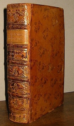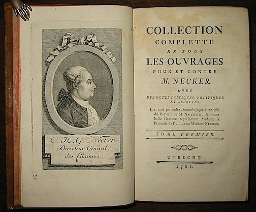 8vo (cm. 21), 3 Tomi legati in un vol., 4 cc.nn. (tra cui un ritratto di Necker in antiporta), 35 pp., 1 tabella rip., 52 pp., 50 pp., 18 pp., 47 pp., 39 pp.; 1 c.nn., 123(5) pp., 1 tabella e due carte geografiche rip., 14 pp., 1 c.nn. (bianca), 27(1) pp., 7(3) pp., 5(1) pp.; 3 cc.nn. (tra cui una tav. incisa su rame), 6 pp., 28 pp., 16 pp., 26 pp., 54 pp., 1 c.nn. (bianca), 14 pp., 8 pp. Legatura coeva in piena pelle marezzata con nervi. Ricchi fregi e titoli oro al ds. Tagli rossi. Minimi segni d’uso alla legatura ma, nel complesso, esemplare in eccellente stato di conservazione. Non comune. Per una dettagliata descrizione degli scritti raccolti cfr. Einaudi (1178).