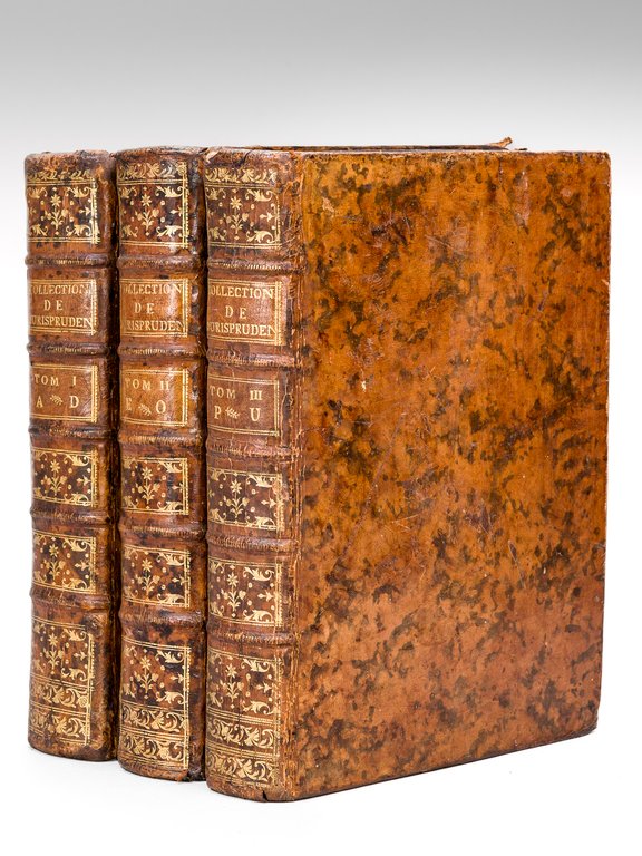 Quatrième édition, 6 parties en 3 vol. in-4 reliure de l'époque plein veau marbré, dos à 5 nerfs dorés orné, toutes tranches marbrées, Chez Desaint, Paris, 1765, VIII-316-543 ; 458-342 ; 480-341 pp. La diversité des règles jurisprudentielles, la netteté des définitions, la présentation des débats doctrinaux, le recours à la législation et aux coutumes, les mises en perspectives historiques ont contribué au succès durable de ce recueil. Bon état (rel. lég. frottées, coupes et coins frottés, agréable exemplaire bien relié par ailleurs). Camus & Dupin, 865 ; Dic. hist. jur. fr., 2456