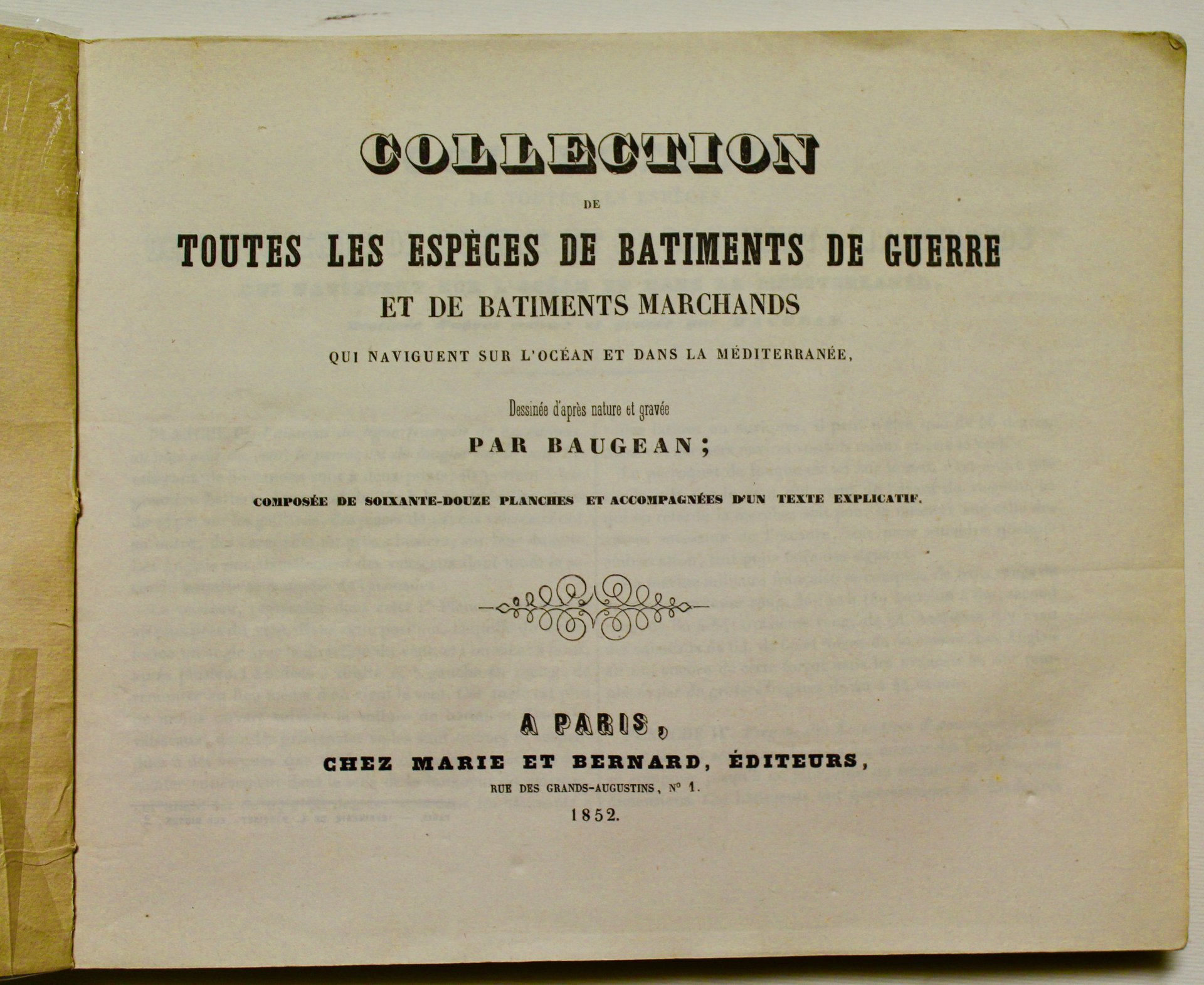 In 8° grande (210x265); pagg. 2 non numerate, 15 num. e 72 tavole in rame disegnate ed incise da Baugean che illustrano galeoni, vascelli, barche, corvette, fregate, brigantini. Brossura editoriale con titolo a stampa. Piacevole opera ben incisa. Bell'esemplare ben conservato con qualche saltuaria fioritura e qualche mancanza al