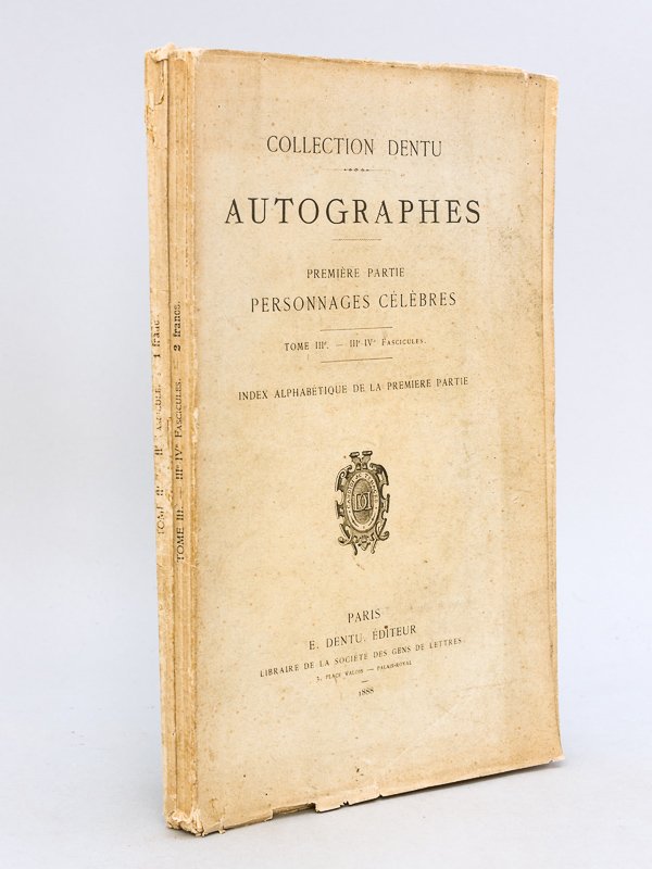 2 vol. in-8 br., Dentu & Cie, Libraires de la Société des Gens de lettres, Paris, 1887, pp. 66-266 Bon état pour ces deux premiers fascicules du catalogue publié par Dentu sous la direction d'Etienne Charavay, de la collection du fameux libraire mais aussi grand collectionneur d'autographes Edouard Dentu (1830-1884).