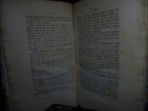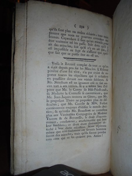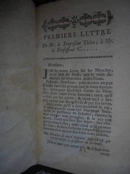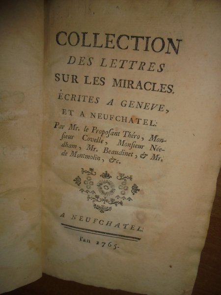 (Critica religiosa) (Voltaire). A Neufchatel, l' an 1765. Collection des lettres Sur les Miracles écrites a Geneve, et a Neufchatel par Mr. le Proposant Théro, Monsieur Covelle, Monsieur Néedham, Mr. Beaudinet, & Mr, de Montmolin. Prima edizione. In-8° antico, cartone coevo. 232 pp. A metà luglio del 1765, Voltaire produsse un opuscolo di venti pagine intitolato Domande sui miracoli à M. le professeur di Cla *** par un proponente, sperando nel migliore dei casi per una risposta del suddetto pastore, pensando poco che avrebbe portato al pubblicazione undici mesi dopo, nel maggio 1766, di un volume di 232 pagine intitolato Collection des lettres sur les miracles, composto da vari brevi scritti del periodo. La serie di venti lettere immaginarie di Voltaire potrebbe a prima vista essere vista come una sequenza cronologica, superficiale come la domanda mutevole e fugace che affrontano. Ma la Collezione è allo stesso tempo un attacco al cristianesimo; un attacco a John Turberville Needham, un nuovo avversario anti-filosofico per Voltaire; e una disputa politica che mette in discussione il rapporto tra autorità ecclesiastiche e governo civile, contestato dalla situazione in Svizzera in quel momento. Esemplare raro e ben conservato con barbe. Casa mob. grande