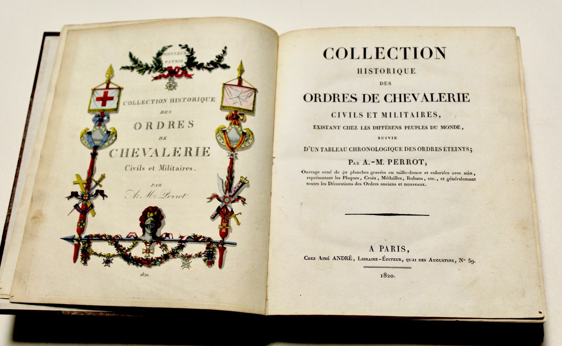 In 4° (mm 242x202); pagg. XXIV, 294 con 40 tavole (compresa l'antiporta) fuori testo incise in rame e dipinte a mano d'epoca (39 numerate, 2 più grandi ripiegate), ogni tavola raffigurante numerose onorificenze, abiti da cerimonia, medaglie, collari, croci di tutti gli ordini cavallereschi, vecchi e nuovi, tutto diviso per nazione. Elegante ed essenziale legatura amatoriale moderna in mezza pelle a fascia larga con angoli, titolo in oro al dorso, piatti a spruzzo nero. Edizione originale di questa bellissima opera, di notevole interesse e con un ricchissimo apparato iconografico. Bell'esemplare su carta forte, minimo ingiallimento della carta e leggerissime saltuarie fioriture.