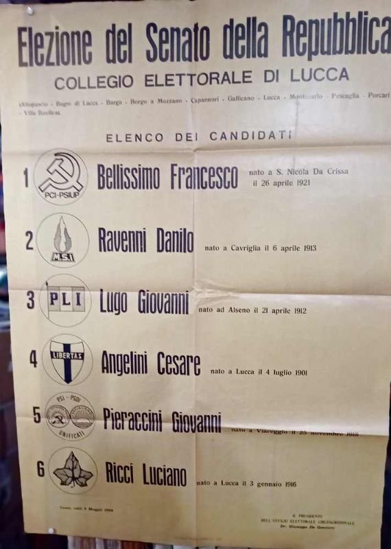 Manifesto cm, 100x70, con stampati i simboli dei vari partiti.