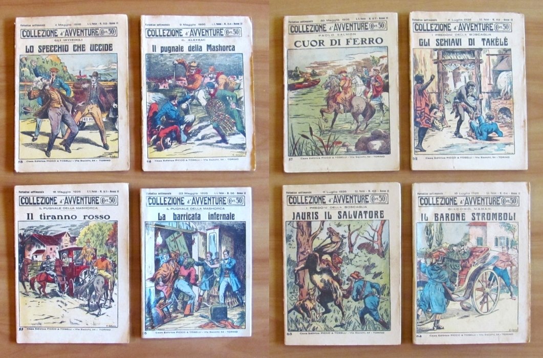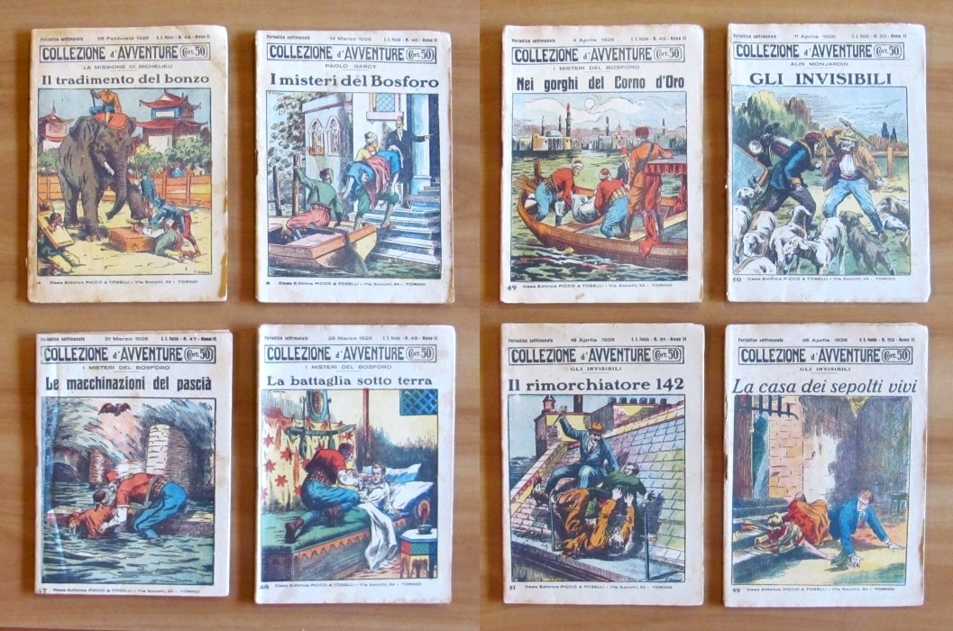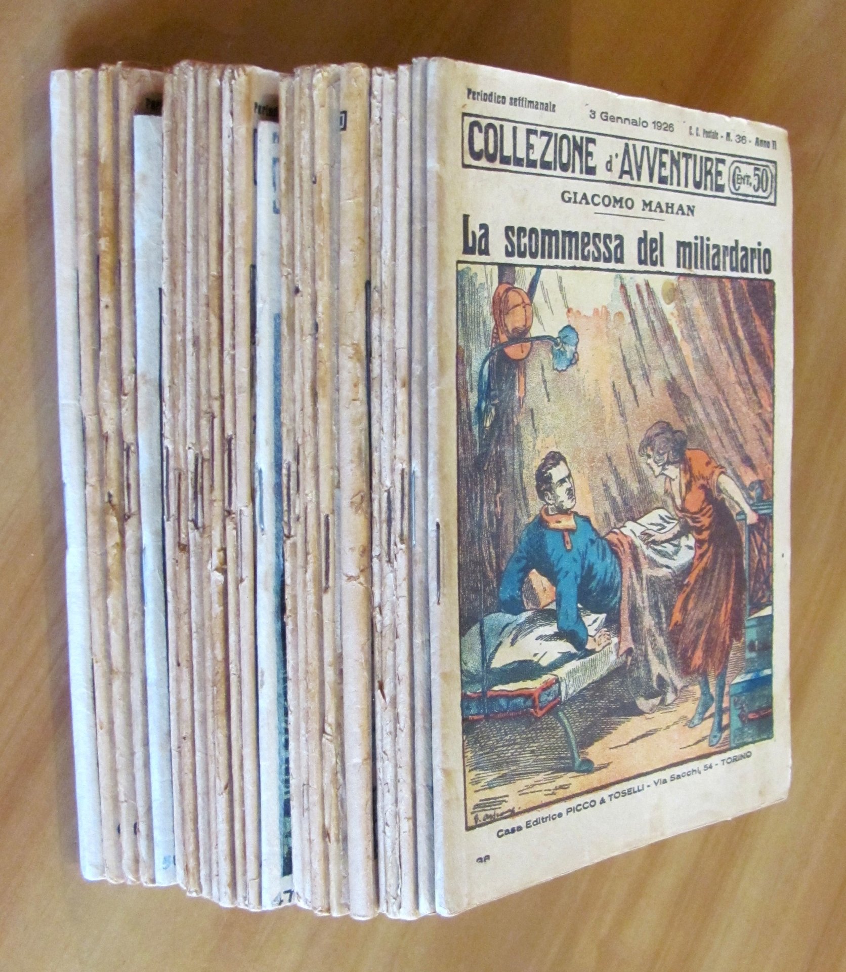 Lotto di 24 Numeri: 36, 37, 38, 39, 40, 41, 42, 43, 44, 46, 47, 48, 49, 50, 51, 52, 53, 54, 55, 56, 57, 62, 63, 64. Copertine a colori e 3 illustrazioni in b/n, a piena pagina, in ciascun Fascicolo. Casa Editrice Picco & Toselli - Torino, 1926. Brossure originali spillate in tutti i fascicoli. Minime imperfezioni