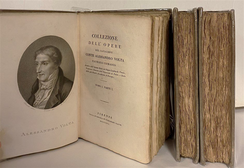 3 voll. in-8, pp. (10), XII, 278, (2), 2, 506, (2); X, XXVI, 268, (2), 302, (2), 2; 388, (4), 2, leg. t. tela coeva con tass. in carta e tit. mss ai d. Con 7 tavv. ripiegate al fine dei volumi e in antip. al primo vol. un belliss. ritr. del Volta inc. in rame da Morghen su dis. di Sabatelli. Prima rara ediz. collettiva delle opere dello scienziato (Como 1745-1827) curata mentre era ancora in vita dal collega fiorentino Vincenzo Antinori (1792-1865). Gamba 2689. Le pp.X dell'ultimo tomo sono poste all'inizio del tomo II, p.1. Belliss. esempl. in barbe a fogli chiusi. [550]